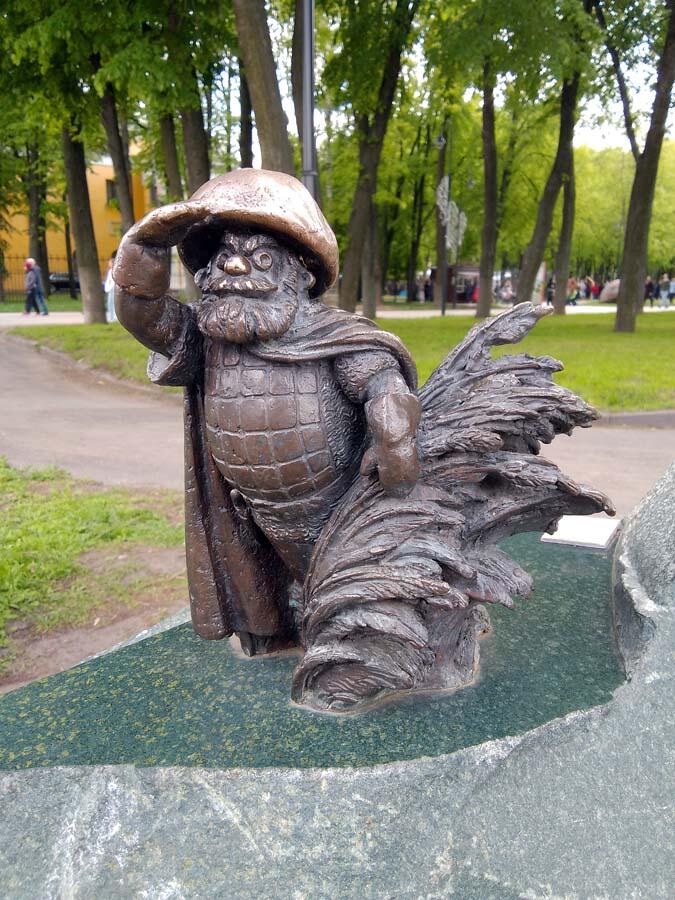 Рязанский Гриб-дозорный стоит перед мостом у Кремля. Крепкий, пузатый, с таким лучше не связываться! Похоже, это - дубовик. Внимательно всматривается он вдаль – не приближается ли к городу враг, не пора ли бить тревогу. Рязань под надёжной защитой.