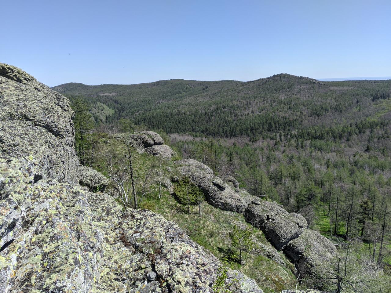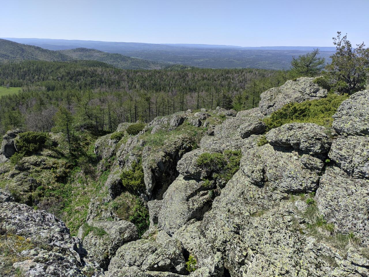 Следующая вершина - безымянная 1057 - поинтереснее. Здесь очень много мощных скал, а со скал - много точек для обзора в разные стороны. Увидели с неё все окружающие хребты, и даже далёкие Ямантау с Иремелем разглядели (но камера телефона их не сняла бы).