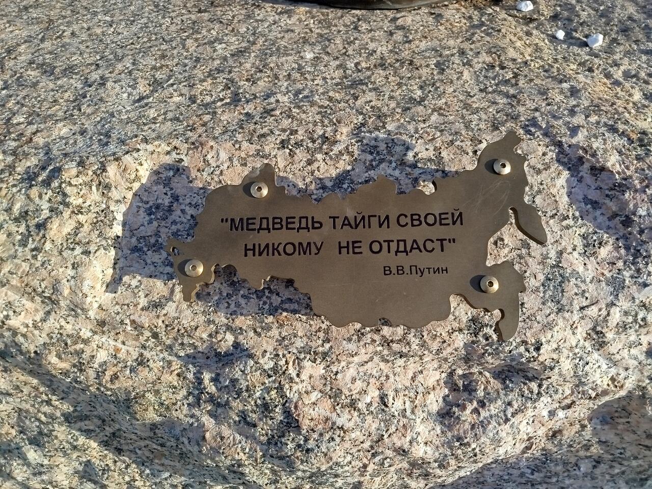 Общий вес монумента «Спящий медведь» составляет около 19 т. На гранитном камне закреплена бронзовая табличка со знаковой цитатой Владимира Путина: «Медведь тайги своей никому не отдаст», как напоминание о несгибаемости России.