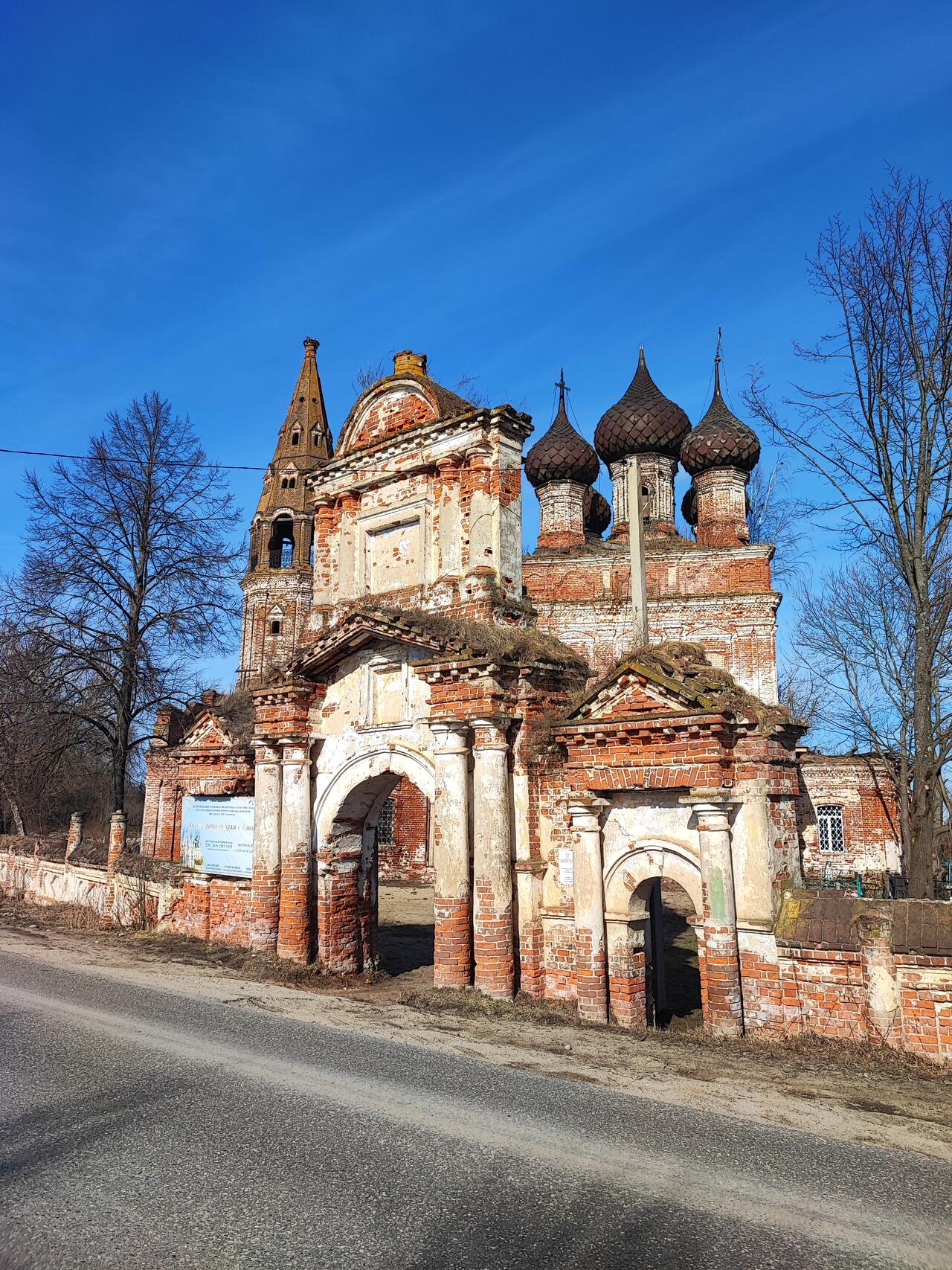 На западной стене над входной аркой написана композиция "Сошествие Святого Духа на апостолов". По сторонам от неё размещены клейма со сценами из Евангельского цикла, в их числе: "Благовещение пастухам" и "Жёны мироносицы у гроба Господня". В своде трапезной написан образ Троицы Новозаветной с херувимами по фону. Палитра живописи приглушённая, тёплых коричневых тонов, с вкраплениями синего, зелёного,жёлтого и тёмно-красного цветов в облачениях. В настоящий момент село жилое и там проживает около 300 человек; есть школа, почта, медпункт, магазины. Село расположено в 9 км от Нерехты.