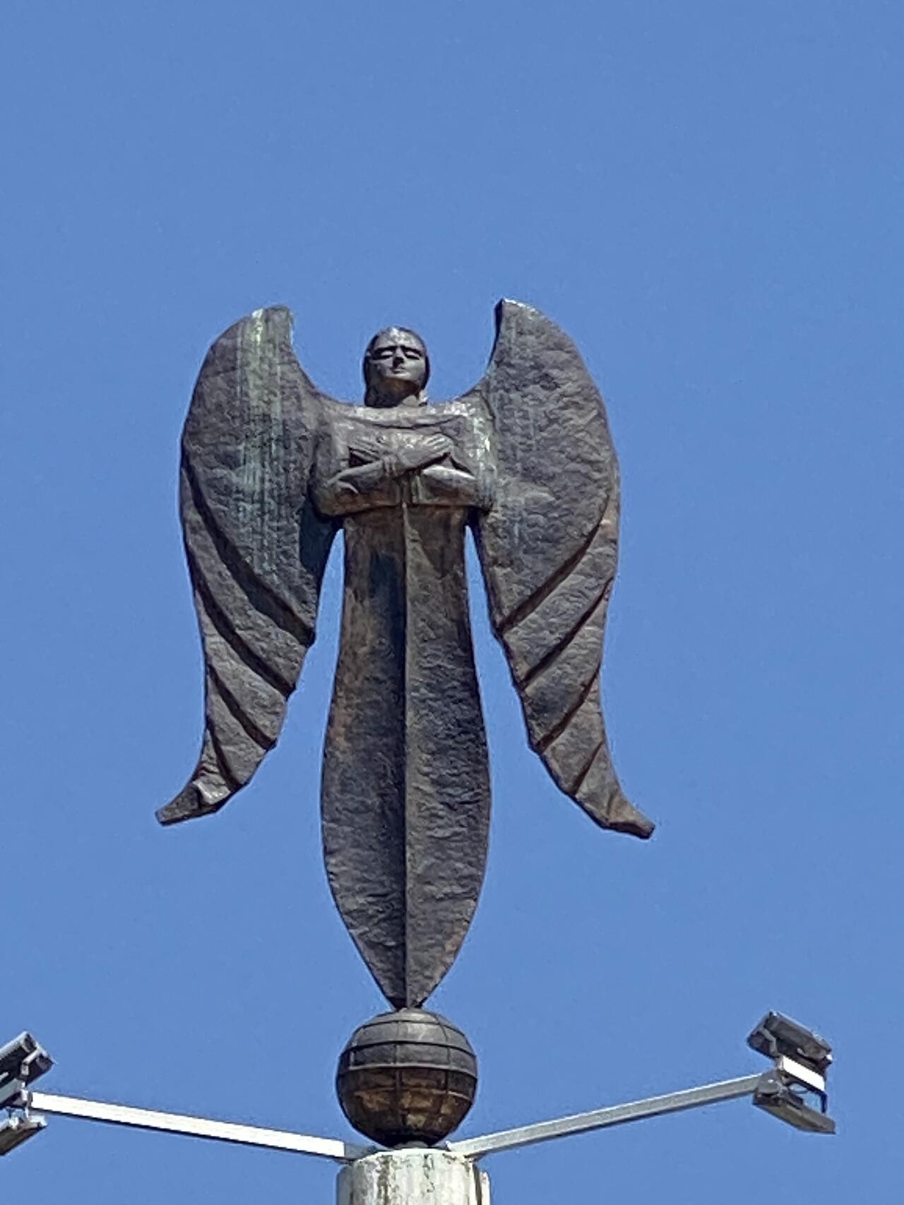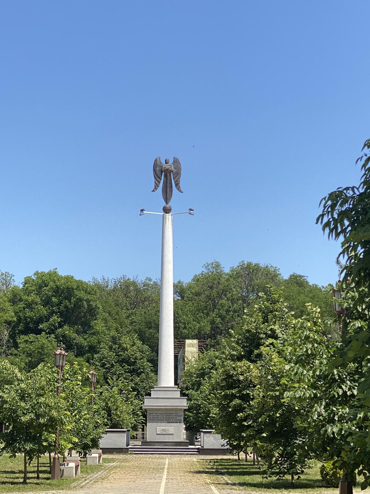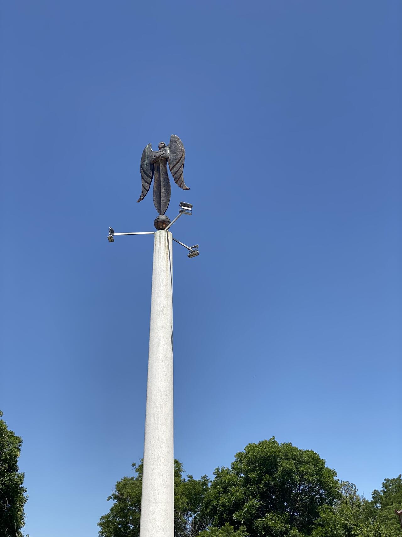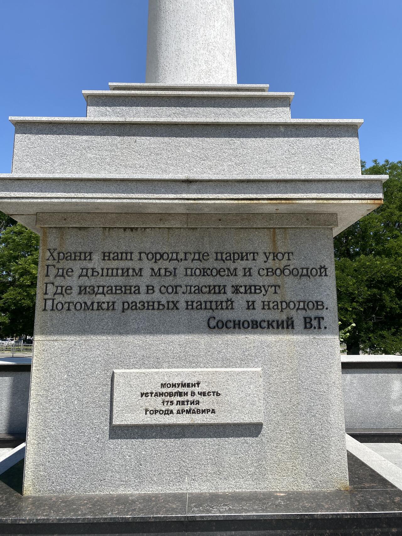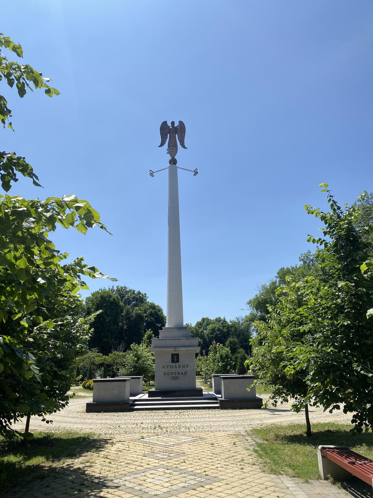 Над созданием монумента работал армавирский архитектор С.Камышин. За основу была взята фигура ангела, который стоит на уменьшенной копии земного шара. Высота монумента более 20 метров. Идею скульптору подал глава города А.Харченко. Эту скульптуру С.Камышин называет своей лебединой песней. Ведь так много сил, таланта и желания приложено для того, чтобы сотворить не просто объект, а новый символ Армавира. И сегодня, раскинув крылья, Ангел-хранитель оберегает любимый город и его жителей.