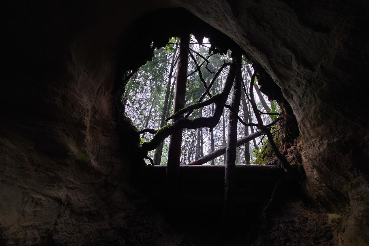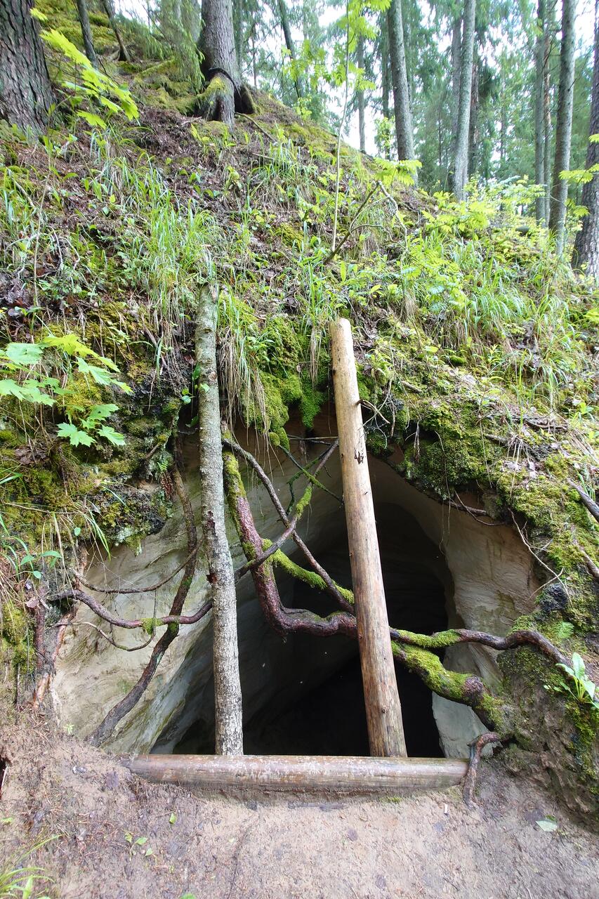 Тропинка привела нас к большому входу под землю, укреплённому от осыпания брёвнами (ну или закрытому ими от падения тел)). Помимо брёвен весь вход обвивает крупный корень, очень красиво.