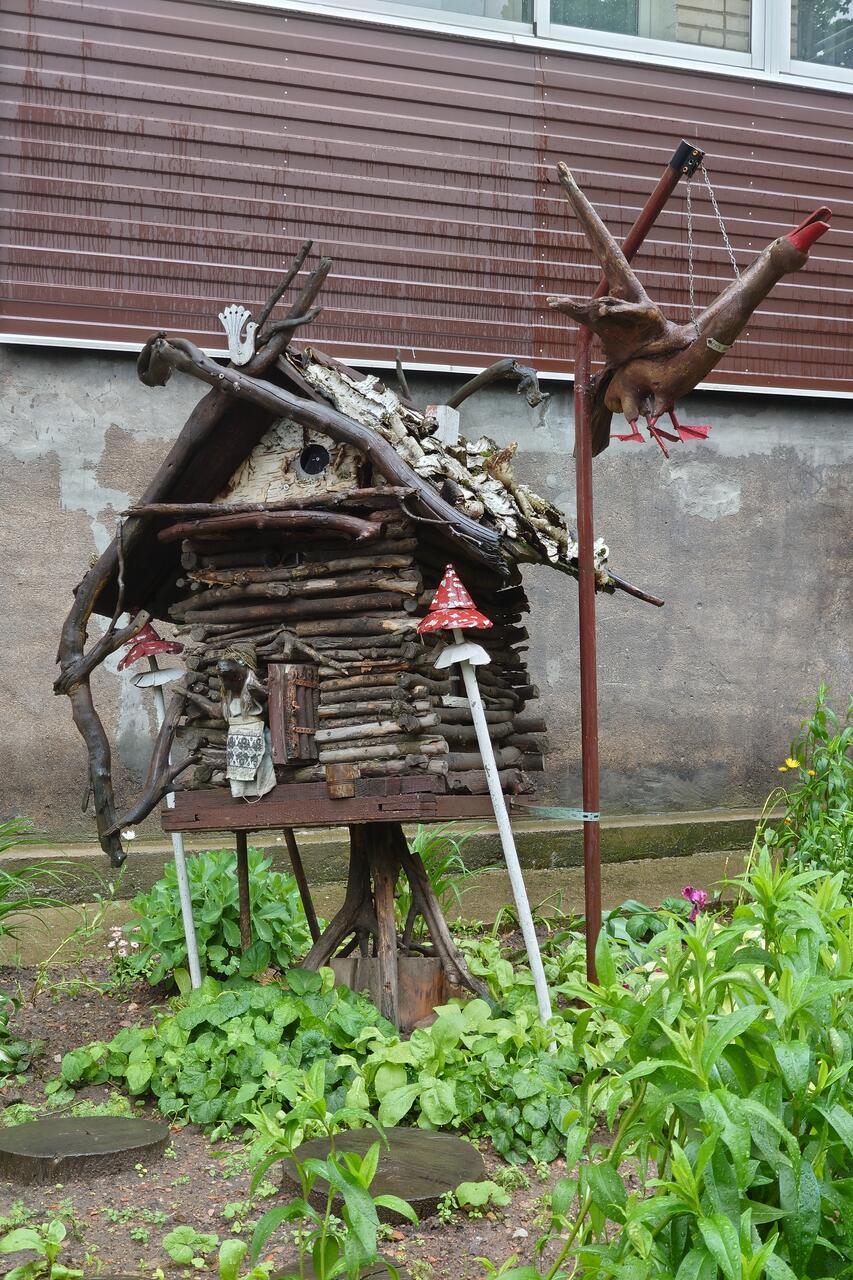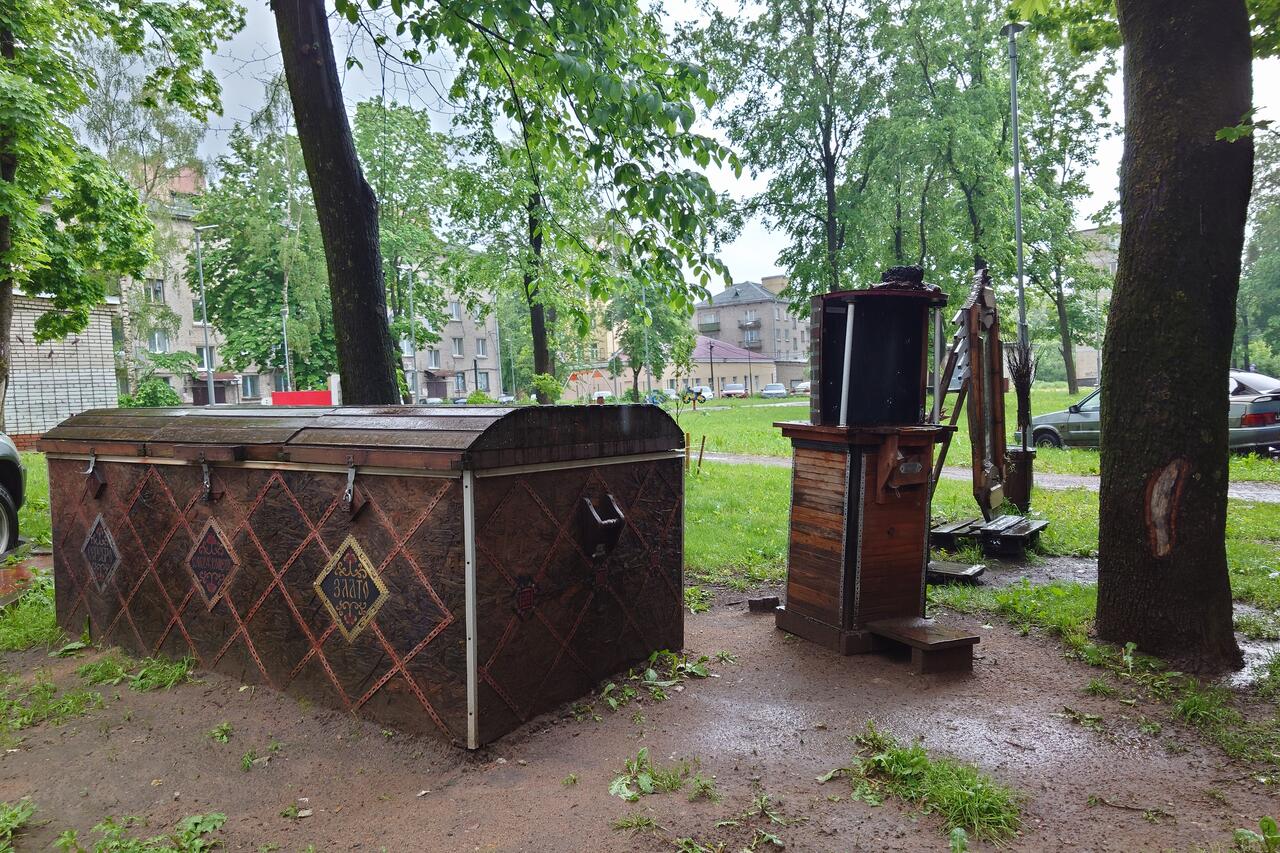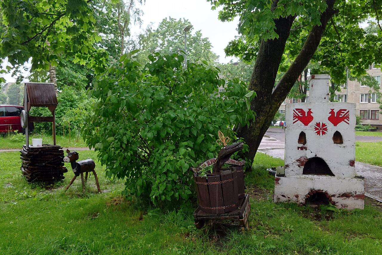 Эх, никого вот дворики не было, чтобы узнать хотя бы, чьих рук это всё дело. Может, и договориться бы удалось. К сожалению, погодка в то утро началась мерзопакостная, дождь лил как из ведра. Поэтому информации добыть не удалось, Но несмотря на тяготы, геокешинг обязывает, и мы осмотрели все объекты.