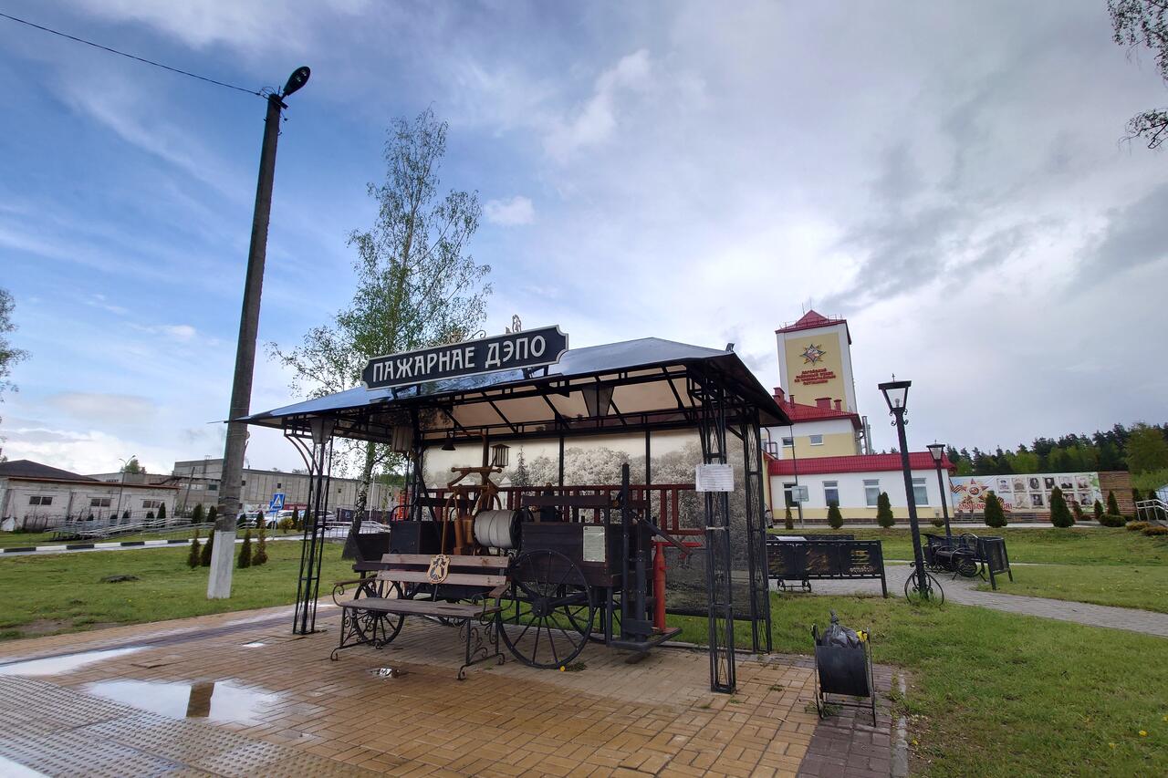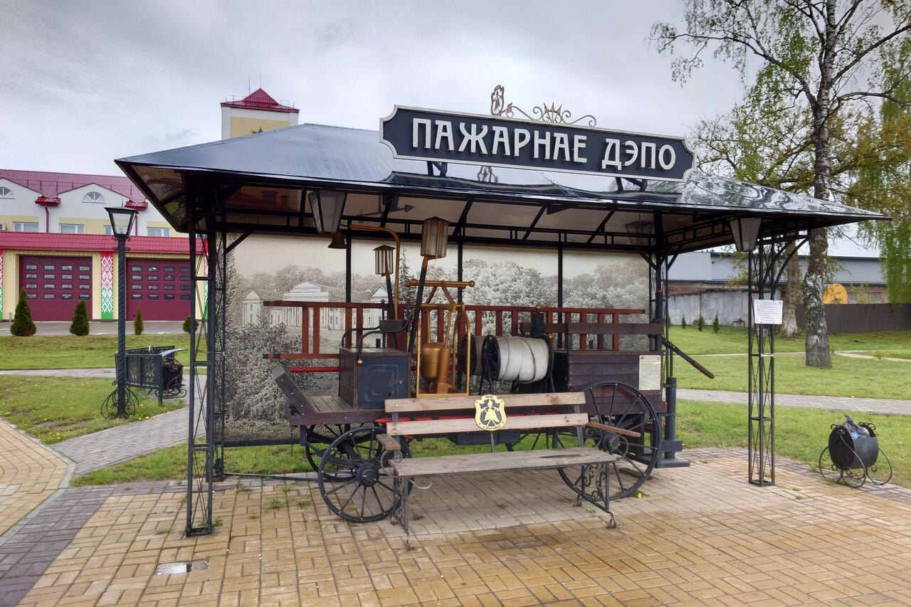 Не хочется писать скучные характеристики пожарных тележек, макет которой установлен так креативно на остановке ОТ перед Пожарным депо в Логойске, послушайте лучше историю, что нашептали мне воды Гайны, знающей всё, что творилось на этой земле когда-либо: