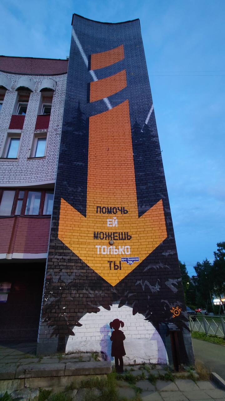 Над созданием арт-объекта трудилась целая команда. Художник Виктор Любимов, приехал из Няндомы. Его пригласил отряд «ЛизаАлерт» в Архангельск, чтобы изобразить на доме № 206 на проспекте Ломоносова стрелку, указывающую на ребёнка. Работает Виктор за идею, абсолютно бесплатно. Спецтехникой тоже обеспечили добрые люди.