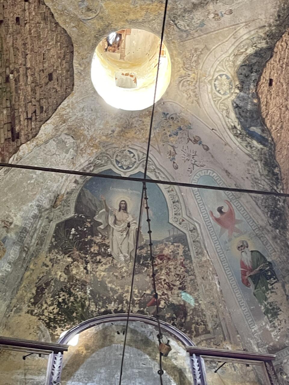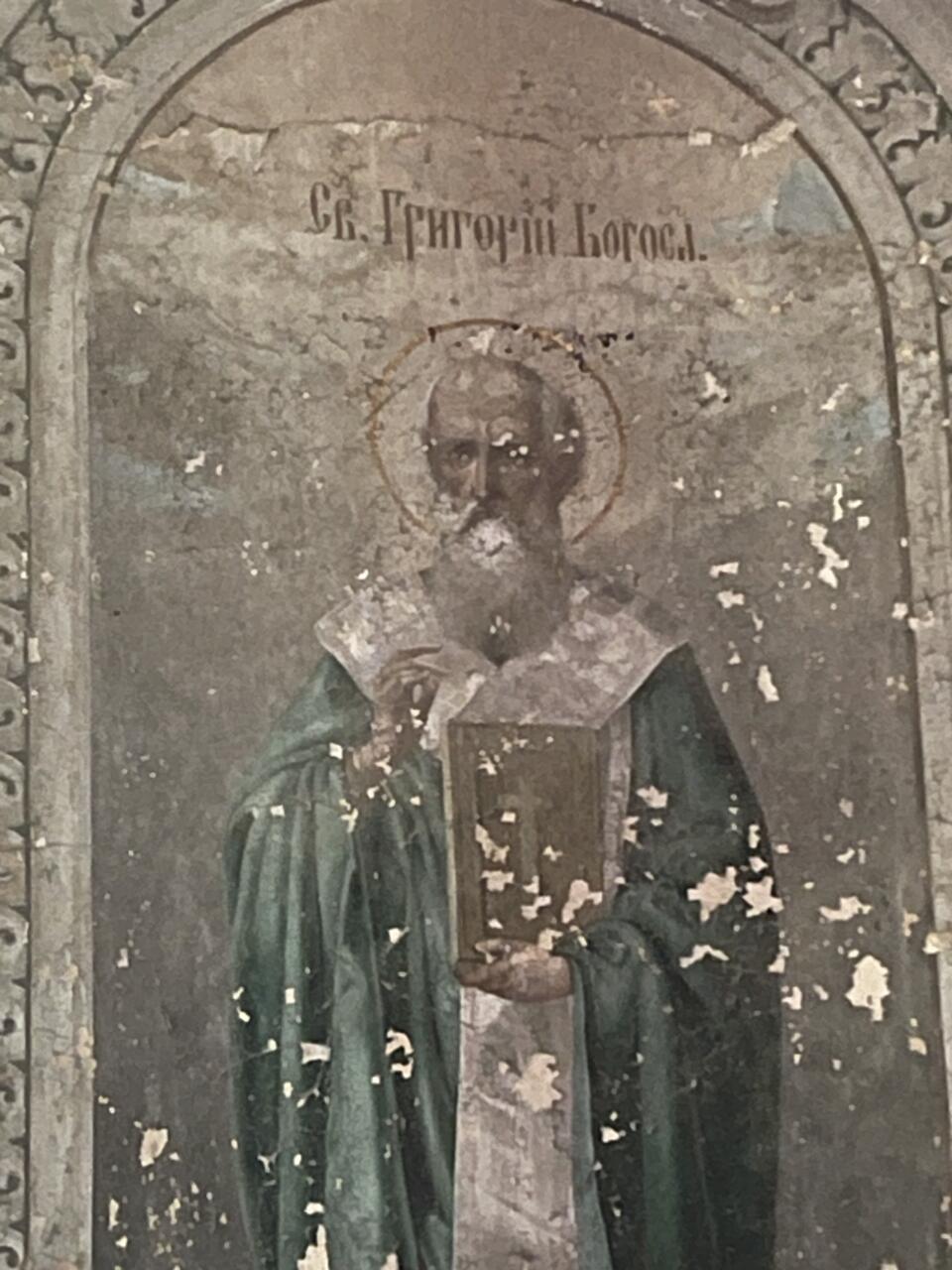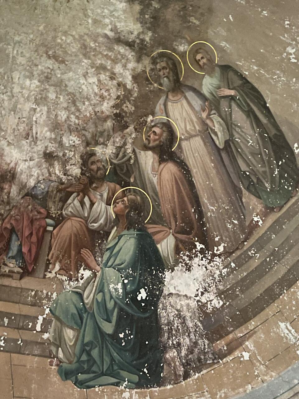 Настенная живопись, скорее всего, была выполнена в нач. 20 в. в масляной технике. Сцены из Нового Завета и фигуры Святителей Московских едва угадываются, а то и вовсе осыпались. В алтарной конхе находится большая композиция "Сошествие Св. Духа на апостолов", а на стенах фигуры Отцов церкви. Вся стенопись выполнена в стиле академической живописи, скорее всего, местными мастерами.