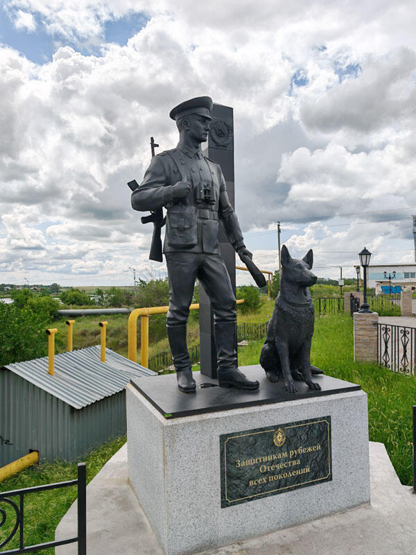 Монумент представляет собой скульптурную композицию, изображающую пограничника с собакой. Он установлен на набережной Свято-Троицкого (Уйского) собора.
