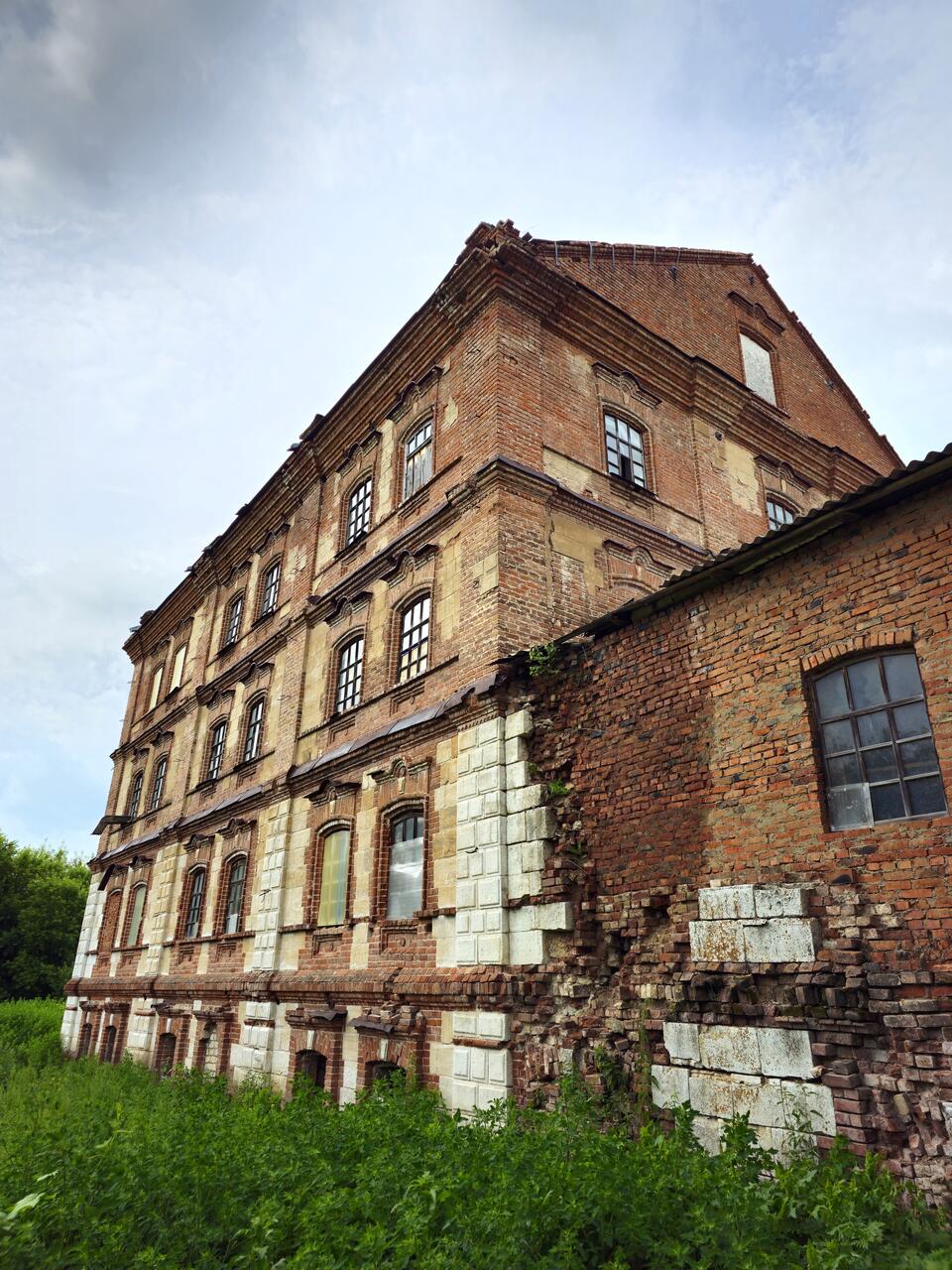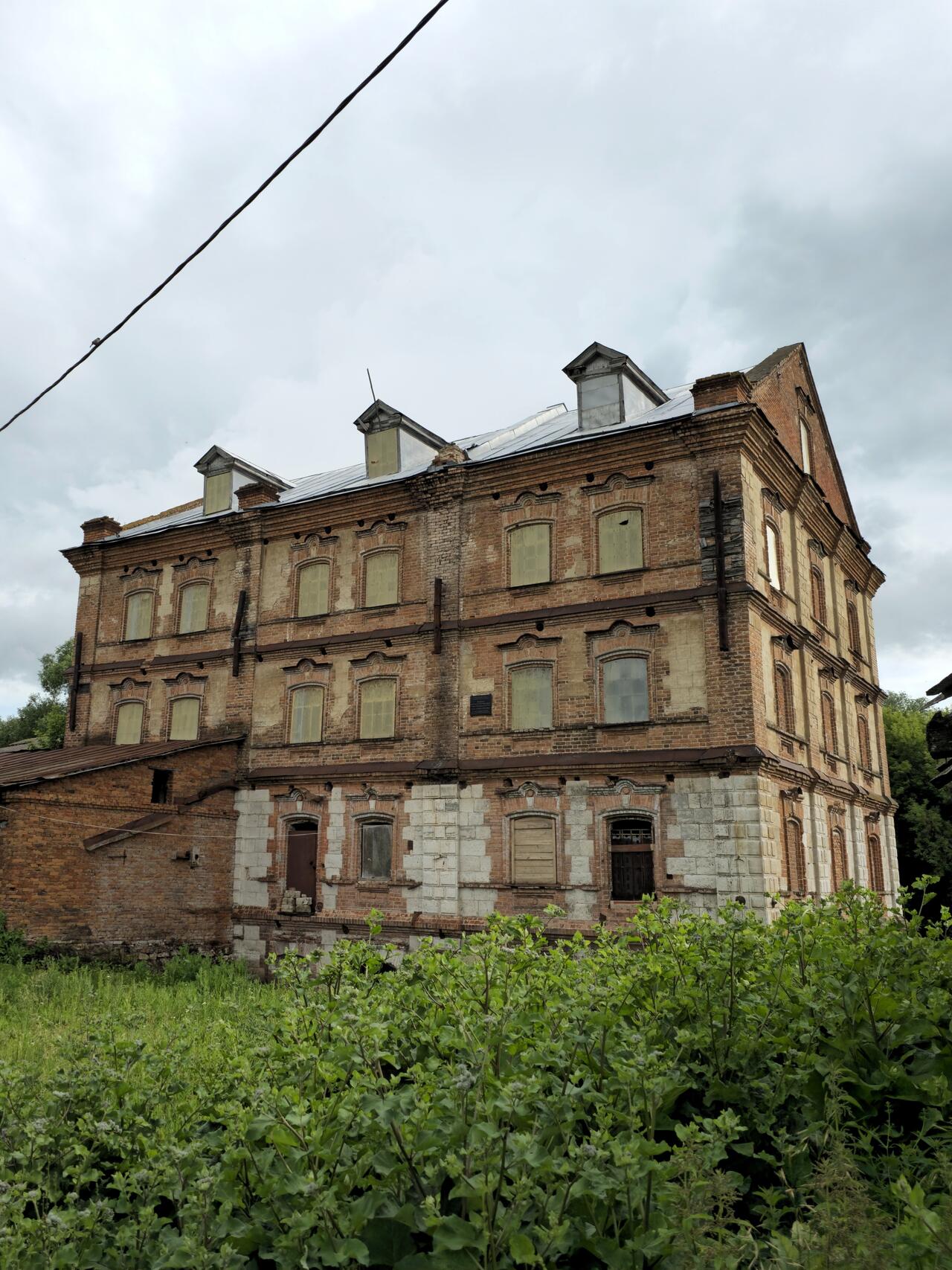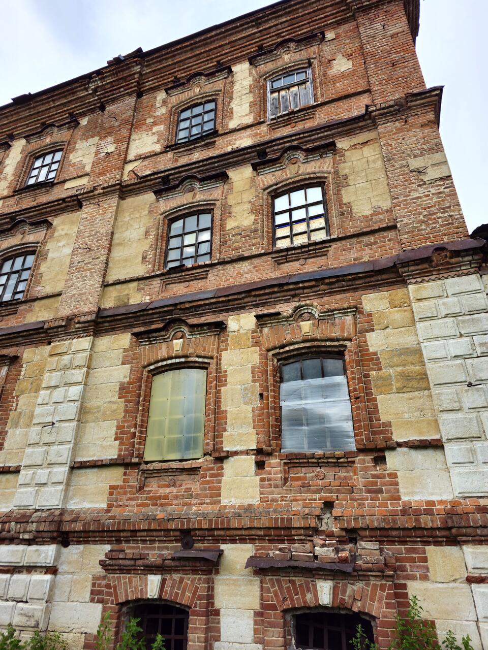 Небольшое архитектурное описание. Фасад З-этажного краснокирпичного корпуса с частичной облицовкой белым камнем расчленен на три равные части лопатками. Каждая из них завершается тумбами над карнизом. Имеются также горизонтальные гурты, делящие фасады на три горизонтальные части. Сближенные в пары по протяженным фасадам оконные проёмы с лучковыми перемычками получили наличники с профилем валика и сандрики с выбеленными замковыми камнями и полочкой с полуциркульной аркой. Под окнами выложены прямоугольные ширинки. Высокая двускатная крыша с тремя чердачными надстройками фланкирована выступающими фронтонами. Интересный образец промышленной архитектуры конца 19 века, демонстрирует романтическое направление эклектики.