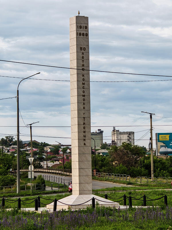 В центр перекрестка была перенесена стела «50-летию комсомола города Троицка». При демонтаже старой стелы монолитный бетон разрушился. Поэтому, стелу отреставрировали и облицевали керамогранитной плиткой. Теперь она имеет более эстетичный вид и максимально приближена к исходной.