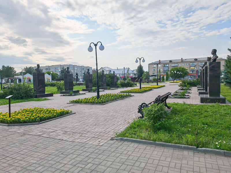 Слева — пять отдельно стоящих памятника троичанам — Героям Советского Союза (в 1970-х годах бюсты Героев стояли справа).