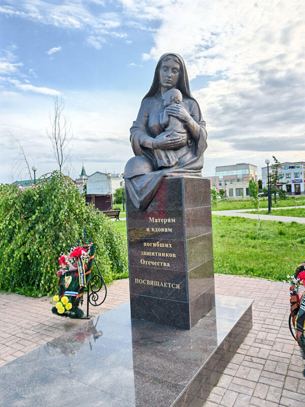 Мемориальный ансамбль сквера также включил в себя памятник «Матерям и вдовам погибших защитников Отечества». Монумент представляет собой полуфигуру скорбящей молодой женщины с младенцем на руках, символически отсылающий к образам мадонн эпохи Возрождения. Композиция создана каслинским скульптором Наталией Куликовой по эскизу Максима Ведерникова (Миасс).