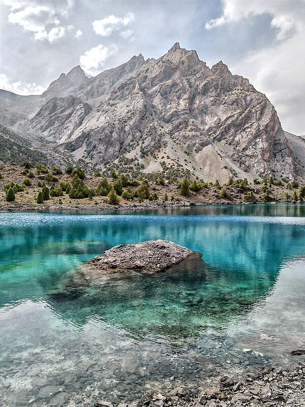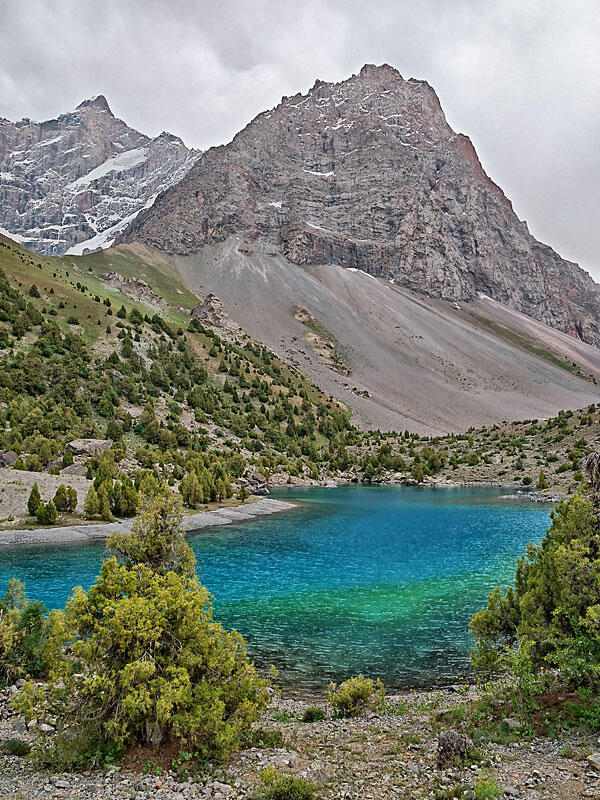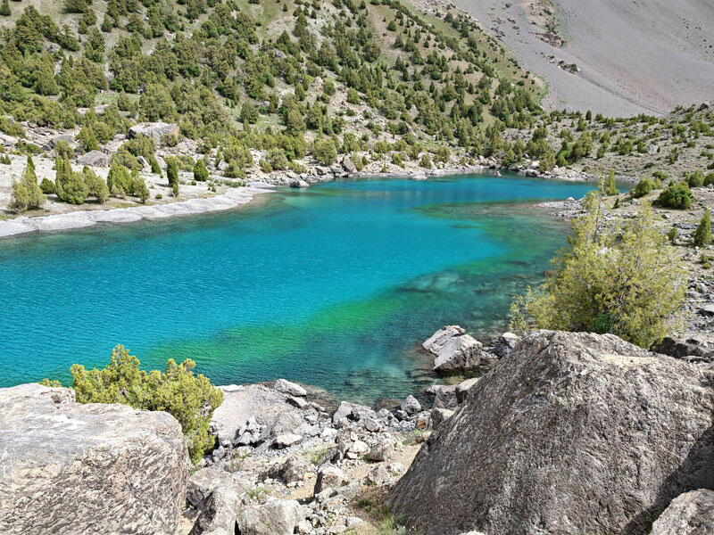 Над Большим Алаудинским озером находится еще одна небольшая древняя морена, поросшая лесом. Выше нее тропа идет среди редкой арчи и травянистых полян, которые были когда-то дном высохших озер. Над правым бортом ущелья высятся стены западного отрога Чапдары.