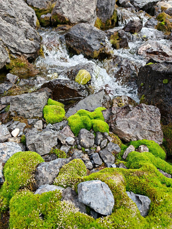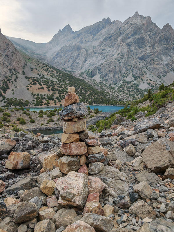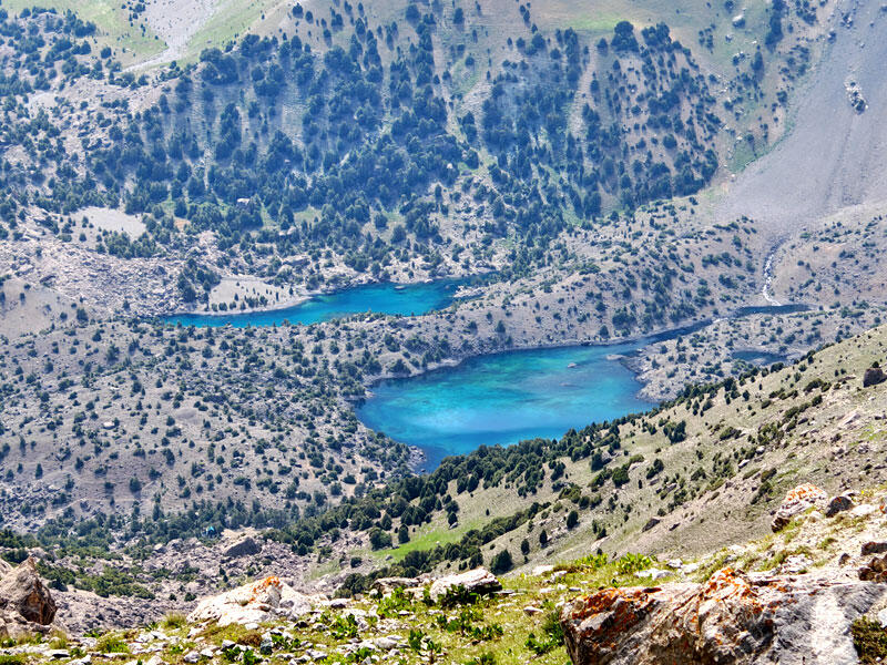 Над Большим Алаудинским озером находится еще одна небольшая древняя морена, поросшая лесом. Выше нее тропа идет среди редкой арчи и травянистых полян, которые были когда-то дном высохших озер. Над правым бортом ущелья высятся стены западного отрога Чапдары.