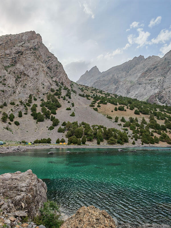Здесь, в юго-западной части находится зеленая поляна, где удобно поставить палатки. На другой стороне озера каменным изогнутым крюком в озеро вдается полуостров. Из Большого Алаудинского озера вытекает река Чапдара и далее разделяется.