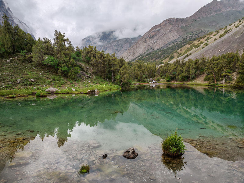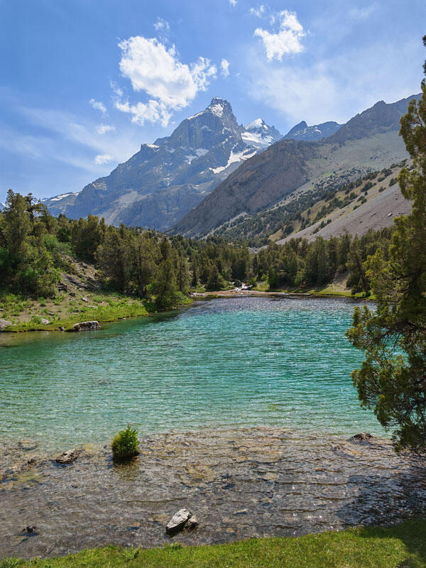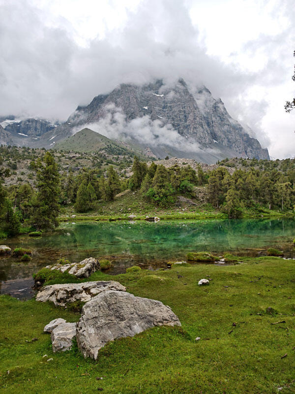 Над Большим Алаудинским озером находится еще одна небольшая древняя морена, поросшая лесом. Выше нее тропа идет среди редкой арчи и травянистых полян, которые были когда-то дном высохших озер. Над правым бортом ущелья высятся стены западного отрога Чапдары.