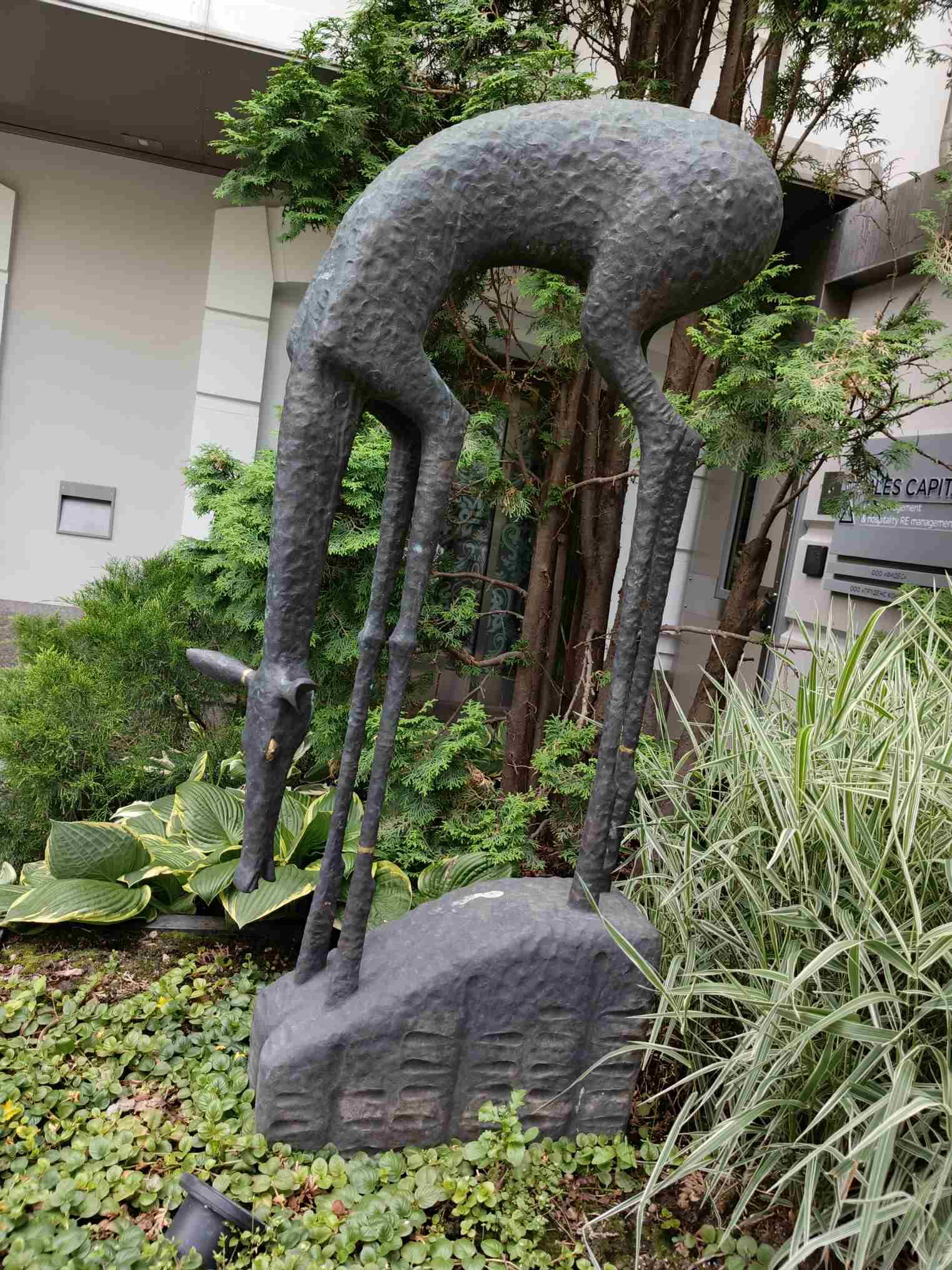 Дальше в углу двора еще одна скульптура, предположительно лань. В центре зеленый сквер, где установлена скульптура девушки на роликах в том же стиле. Кусочек старой Москвы, владения Василия Якунчикова. Нынче здание доходного дома пережило реконструкцию и стало называться жилой дом "Валентин".