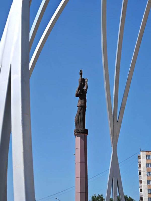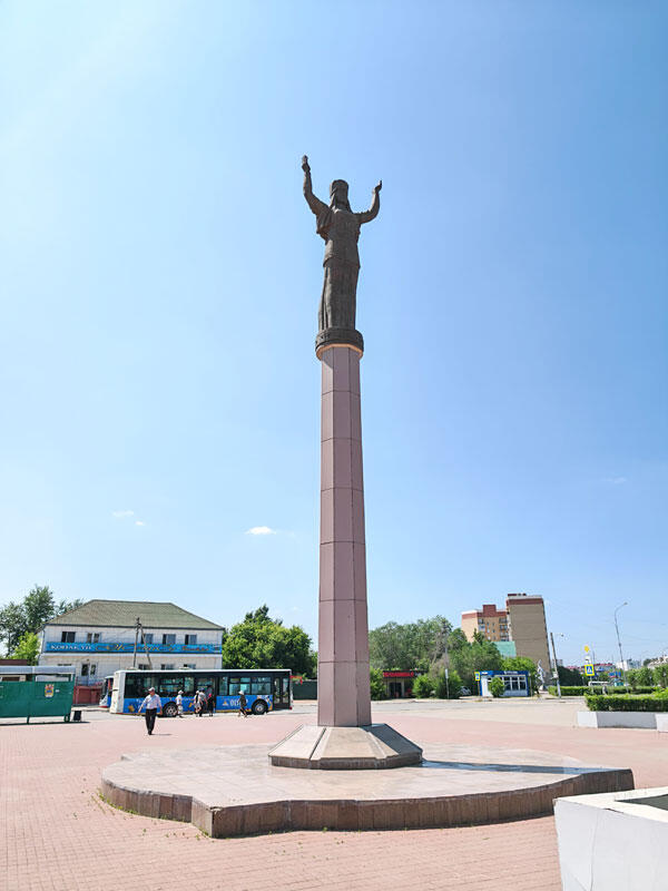 Фигура женщины в рост, с поднятыми вверх руками установлена на высокой восьмигранной колонне. От колонны фигура отделена полочкой с орнаментом «кошкар муйиз» (бараний рог). Колонна высотой 9,5 м облицована искусственными плитами, двухступенчатое основание - полированным гранитом. Фигура женщины высотой 4,5 м - из бронзы.