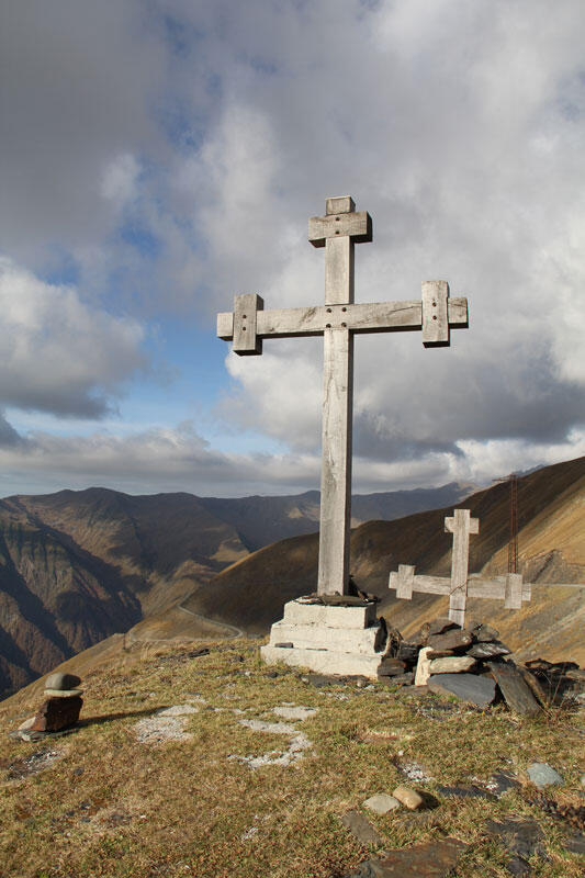 Не знаю, что за вышки без проводов стоят на перевале - остатки советской ЛЭП откуда-нибудь с Чиркейской ГЭС или задел для будущих отелей Тушетии. Скорее всё же первое... Горцы обходятся дизелями и солнечными батареями, а на вершине перевала в независимой Грузии появился триптих из сотового ретранслятора, креста и часовни. Часовня впечатляет простотой и архаичностью - кажущиеся наспех сложенными каменные стены, деревянный потолок... думается, примерно такими были горные часовни в эпоху Алании, строившиеся для вайнахов грузинскими миссионерами. А крест сам похож на антенну.