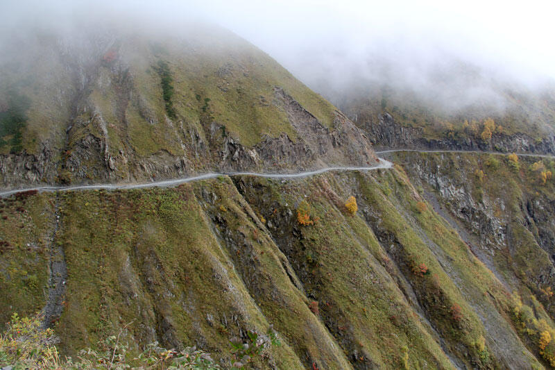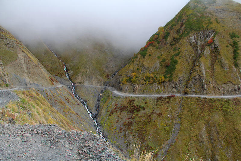 Начало второго серпантина отмечают два водопада, образующие на склоне перевёрнутую "А" с перекладиной дорог. Сама дорога отсюда выглядит как нить, накинутая на склон. Дорога ничем не закреплена, и в окно я видел порой, как скачут вниз по склону сброшенные нами камушки, а при разъезде двух машин колёса повисают над обрывом. А то и - над облаками. Виток за витком машины буквально карабкаются по склону, и совсем немудрено, что "Делик" на Тушетской дороге существенно больше, чем джипов - за свои деньги тут рулить можно разве что из спортивного интереса.