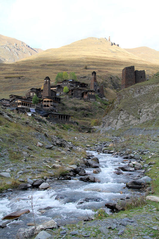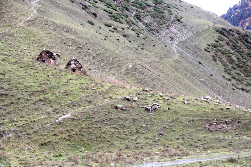 Согласно тушетской традиции, женщины не могут войти ни в руины храма, ни в саму святыню. Для них есть отдельные тропы. В Тушетии много мест, в которые запрещен доступ женщинам, обычно они отмечены предупреждающими знаками. Пожалуйста, проявляйте уважение к местным традициям. Вниз за ручьем у входа в деревню можно увидеть кладбище. На могилах нет крестов — на захоронение просто ставили камень. Кроме того, в поселке можете заметить небольшие сооружения пирамидальной формы. Их всего два. Это мавзолеи. Их строили лишь в исключительных случаях.
