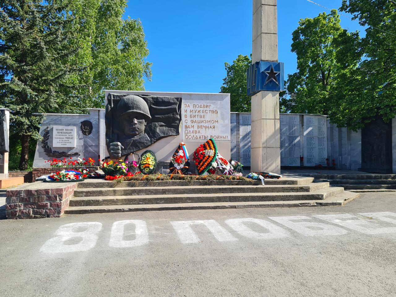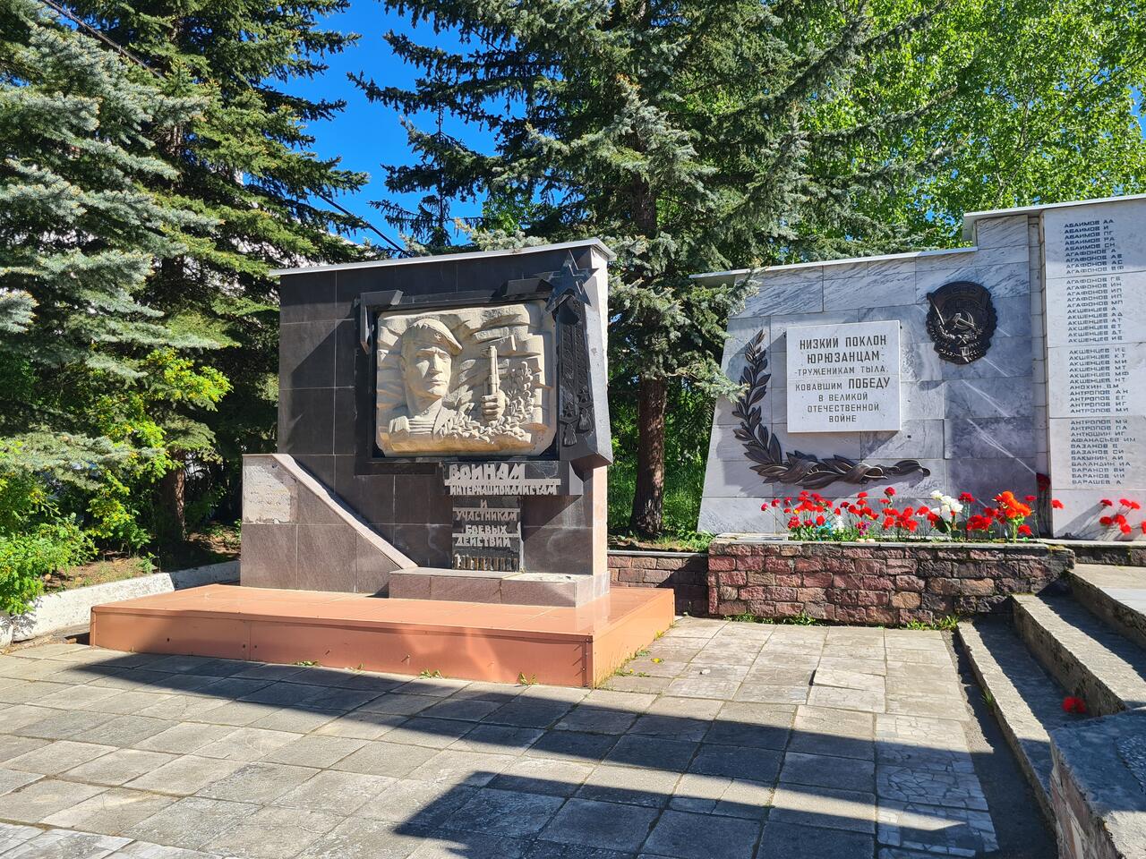 9 мая 1975 года возле Дворца на площади Победы был открыт памятник юрюзанцам, погибшим в годы Великой Отечественной войны, который со временем выстроился в мемориальный комплекс.Около 600 юрюзанцев не вернулись с фронта. В память о них рабочими ЮМЗ был сооружен четырехгранный высотный пилон из бетонных блоков. По его периметру рельефное изображение пятиконечной звезды и цифр 1941-1945, исполненных в бронзе. За пилоном облицованная мрамором мемориальная кирпичная стена с фамилиями и инициалами погибших земляков. Слева от пилона на фоне облицованной мрамором стене — кованное по листовой меди барельефное изображение воина на фоне полотнища знамени и высеченный на мраморе текст: «За подвиги и мужество в битве с фашизмом вам вечная слава, солдаты войны!».