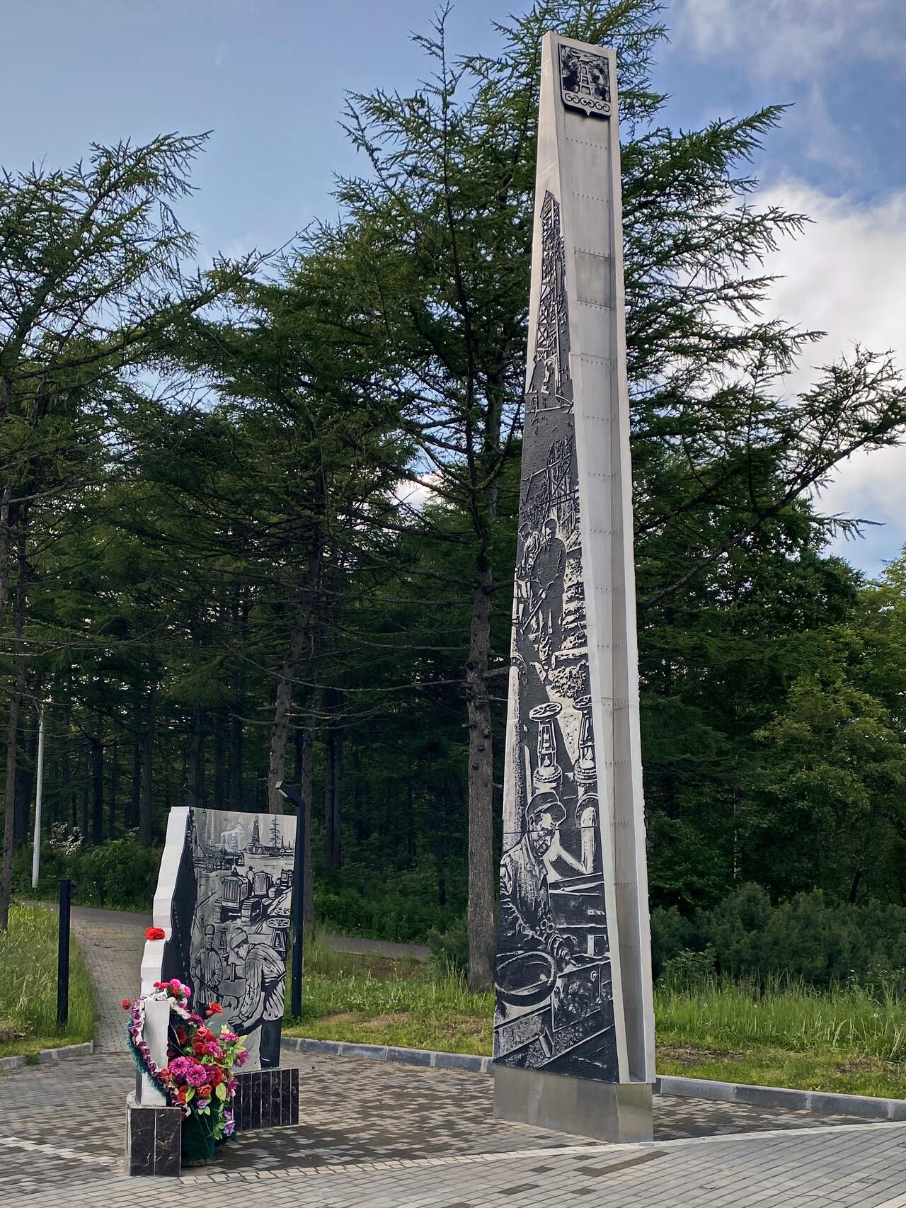 Изготовили стелу в Ростове-на-Дону. Специалисты отказались от идеи собирать стелу по частям в Охе и отправили её в готовом виде на Сахалин на грузовом автомобиле, через всю страну. Директор Андрей Дементьев рассказал, что для суровых климатических условий создан уникальный каркас. «А ещё эта стела тонкая, изящная, с таким сложным изменением рельефа – одна часть сужается, другая расширяется. Узлы очень хитро переплетаются один в другой. Интересное зрелище», – описал он. Художнику, в процессе работы, приходилось согласовывать каждый шаг с проектировщиками и конструкторами – какие материалы в какой части применять, чтобы стела чувствовала себя комфортно и на неё не повлияли перепады температур и снеговые нагрузки.