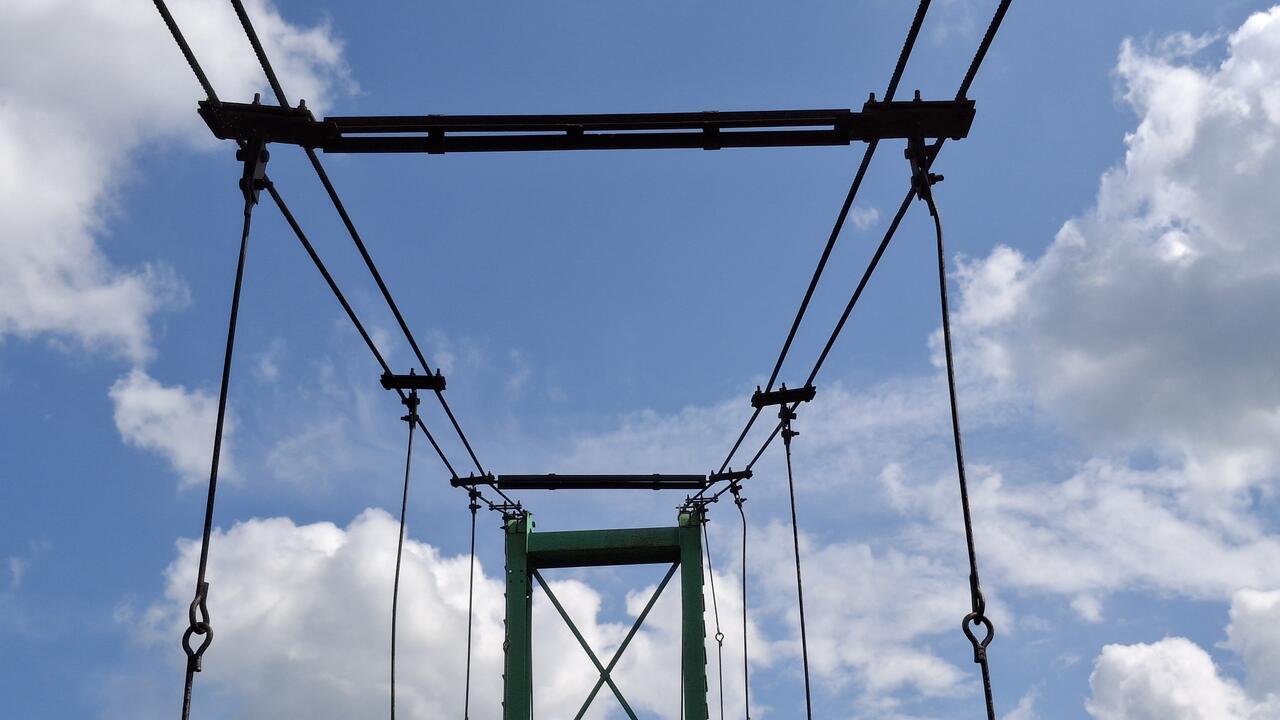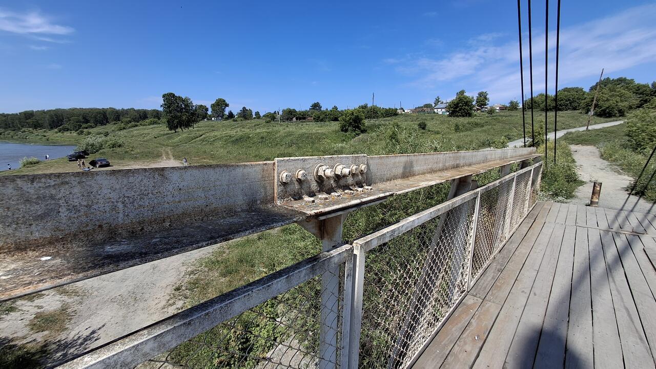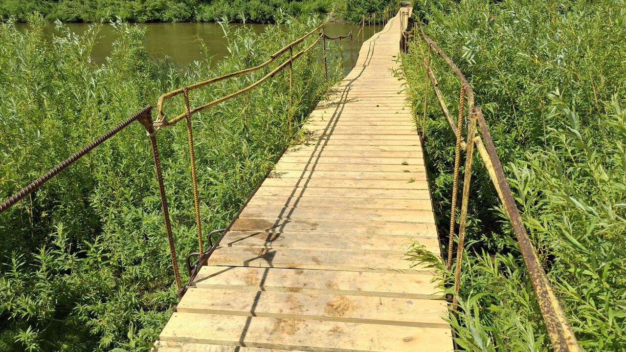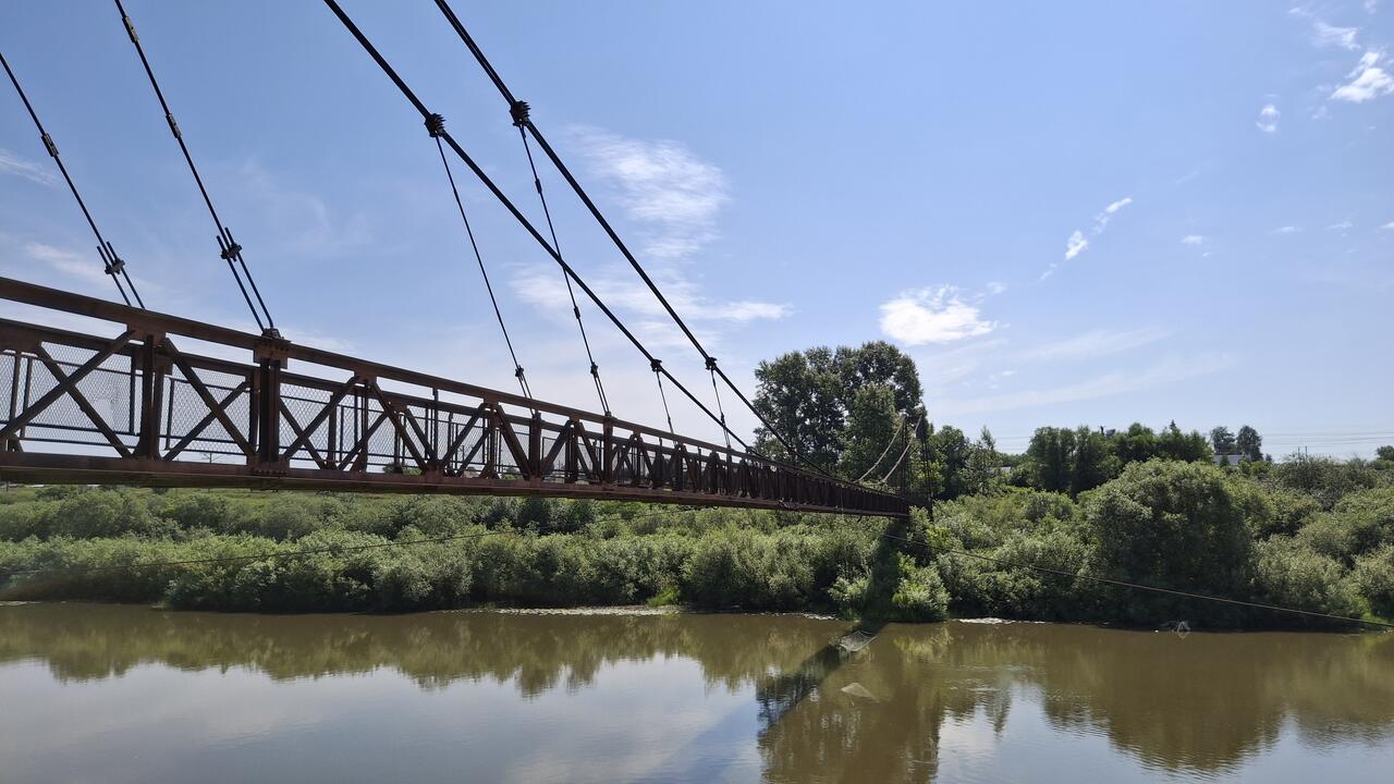 С Санкт-Петербургом конечно сложно тягаться, но и у нас их количество внушительное. Если посмотреть на карту, то от Новосибирска до Тогучина можно насчитать 16 пешеходных мостов через Иню. Большинство из них относятся к разновидности подвесных вантовых мостов и имеют примерно одинаковую конструкцию. Пролет (по которому ходят), канаты (которые держат этот пролет) и 2 пилона. Пилоном называют опору моста (в нашем случае – в виде рамы), на которой крепятся удерживающие пролет канаты. Канаты протянуты через верхнюю часть пилона и закреплены к перилам моста.