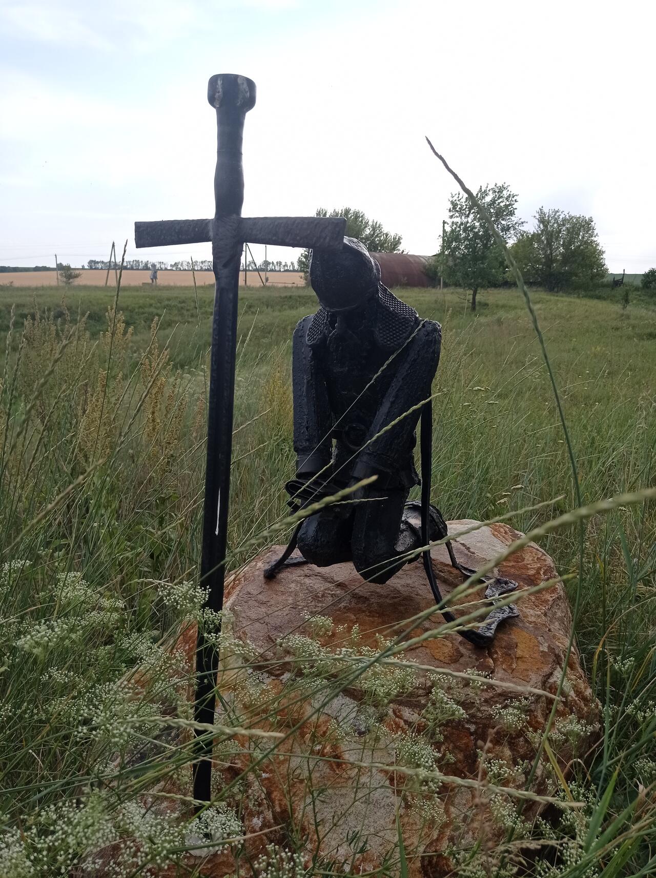 А скульптура на валуне над источником и над воинским захоронением не простая. Называется «Моление». Кованая скульптура «Моление» авторства председателя Союза кузнецов-художников России, потомственного кузнеца из Подмосковья, создателя кузнечного музея Валентина Воробьева, который летом 2021 года по приглашению Сергея Спасского побывал в Красном Пахаре. Примечательно, что она в свое время даже выставлялась в Лувре во время выставки работ российских кузнецов.
