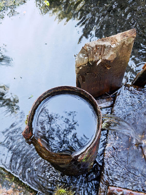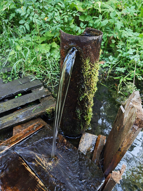 Проехав вокруг карьера, немного дальше основной дороги, я увидет отворот направо и решил разведать это направление. Довольно быстро дорога привела на поляну с торчащей металлической трубой из которой хорошим напором течет вода, образуя большую лужу. Рядом на дереве висит кружка, чтобы удобно было попить. Вода на вкус приятная, не очень холодная, без посторонних привкусов. Водоотдача приличная, легко можно набрать большую флягу.
