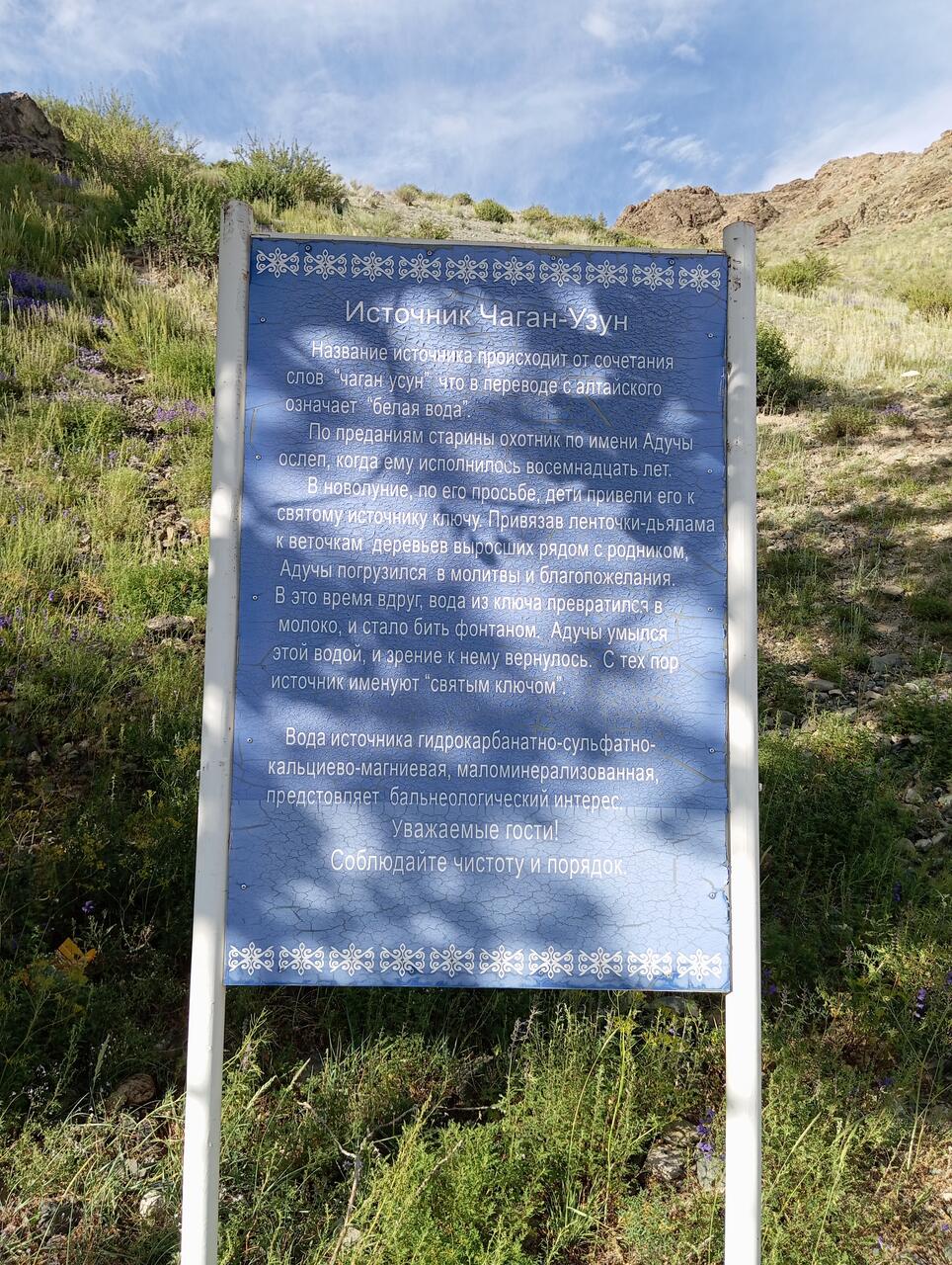 Чаган-Узунский источник, как и многие другие на Горном Алтае также отмечен привязанными особым способом ленточками, место требует от всех соблюдения чистоты и порядка, чтобы не обидеть духа родника. Для этого рядом есть и туалет, и место сбора мусора, и место для отдыха, не гневите духа родника.