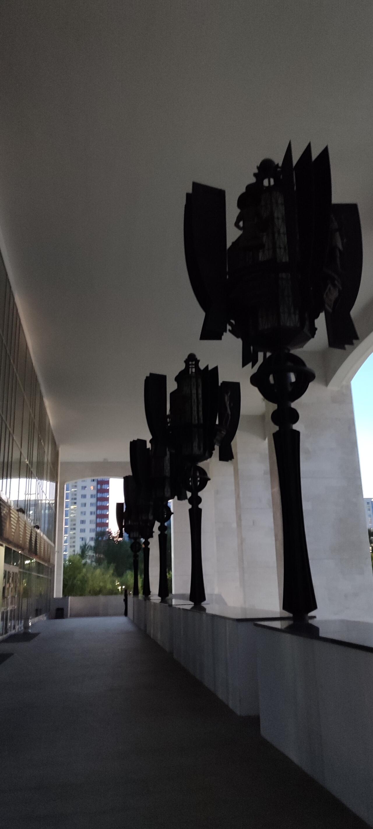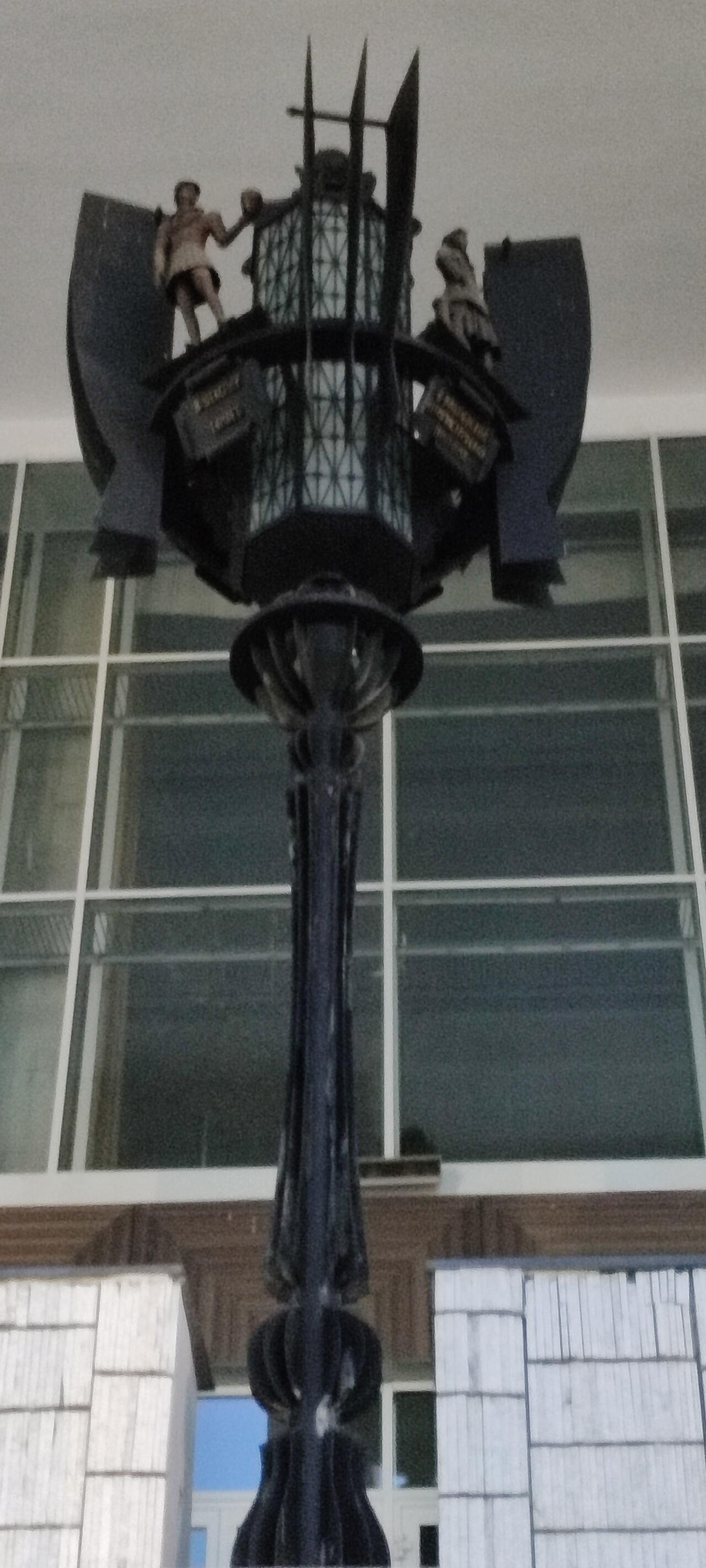 А теперь можно и к волшебным фонарям подняться. Не зря они привлекли моё внимание - «папа» у них общий с Челябинскими Порталами в прекрасное – скульптор Юрий Александров. Создал он эти фонари в соавторстве со скульптором Иваном Казанским для нового здания Пермского драмтеатра в 1982 году. А в 2022 их пришлось восстанавливать практически заново – ободрали лихие люди медь фонарей на металлолом. А ведь фонари задуманы и вправду волшебными – они не только светятся, но и вращаются! Механизм вращения авторы подсмотрели у перископов подводных лодок!