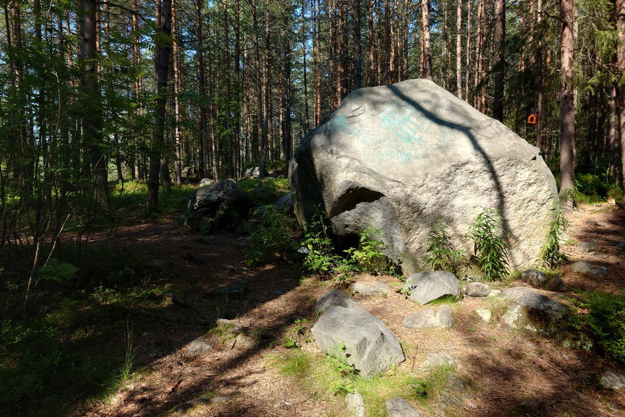 Увидели этот воздушный мост и тут же захотели по нему в красивый сосновый лес перейти! А там... Поскакали зайчики по тропинкам, белочки по ветками деревьев, пошуршали ёжики по мху, в общем, все ринулись навстречу, только медведь не пошёл, чтоб не напугать. Спрятался за Вещим камнем, подсматривает - интересно же, чего будет!