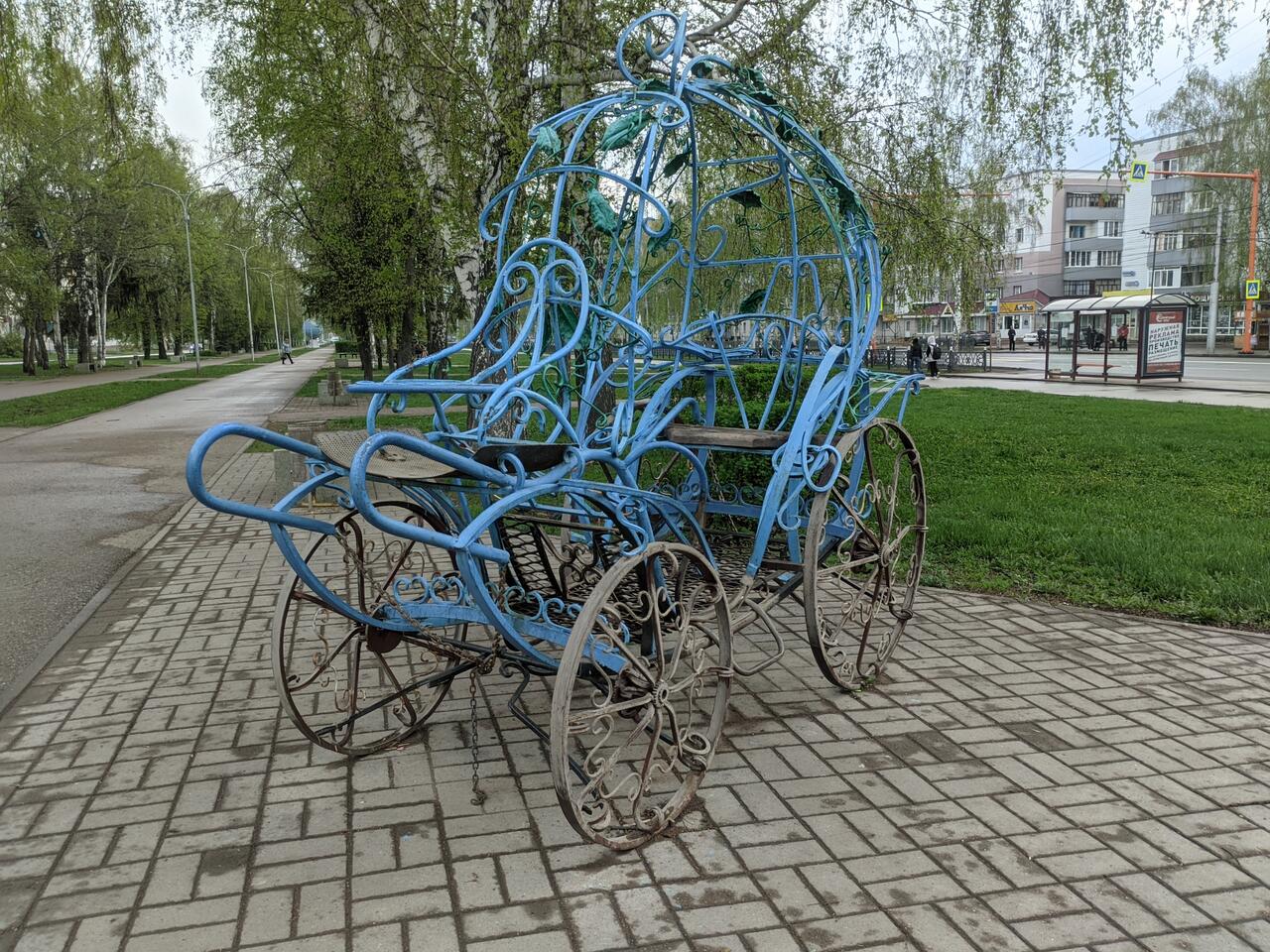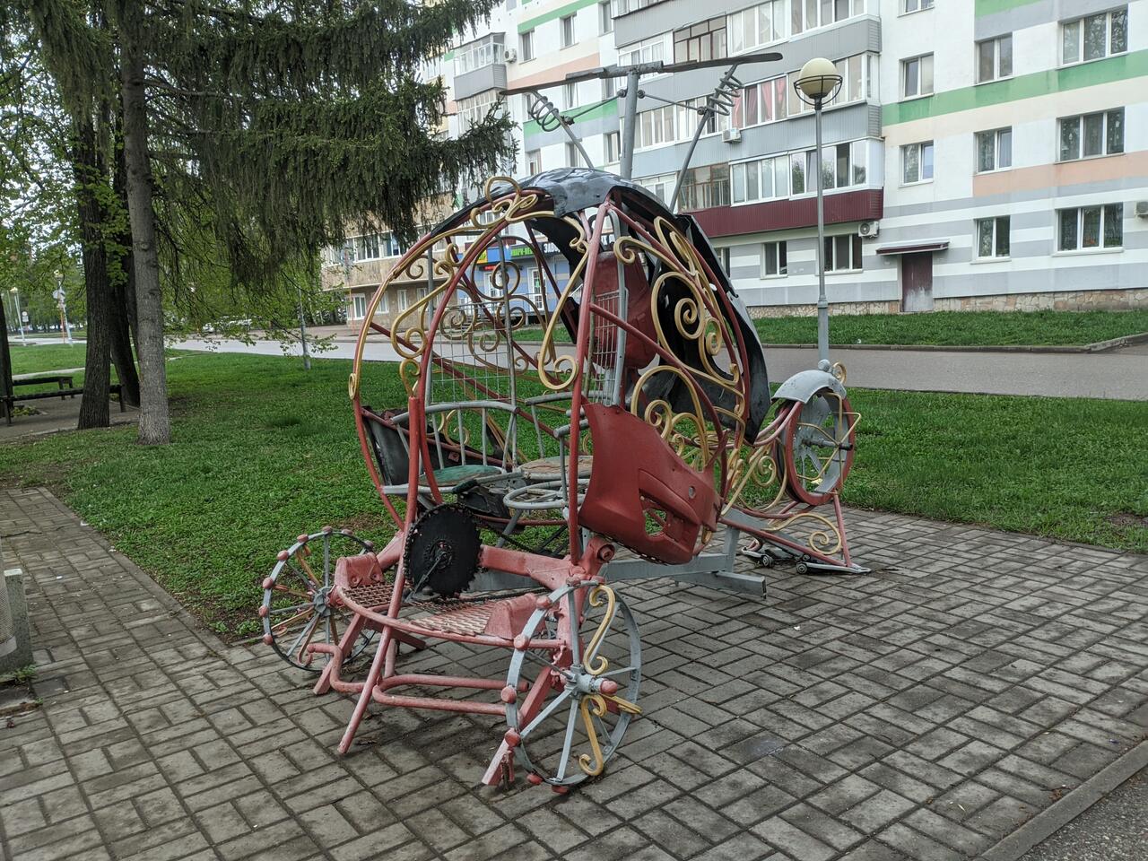 В Стерлитамаке, в сквере на улице Коммунистической расположился целый арсенал различных транспортных средств. Карета, вертолётик, паровозик и пожарный автомобиль созданы неизвестным мне автором в стиле "детский стимпанк". То, что это игровые модели становится понятно сразу по их виду, габаритам и окраске - маленькие, миленькие и весёленькие. Но детали! В полном соответствии с традициями стимпанка привычные предметы здесь получили новый смысл и функционал.