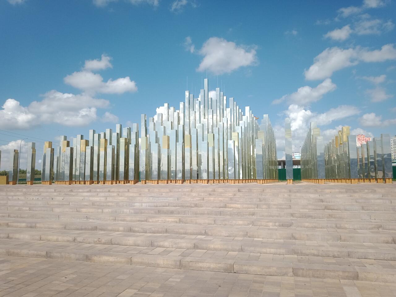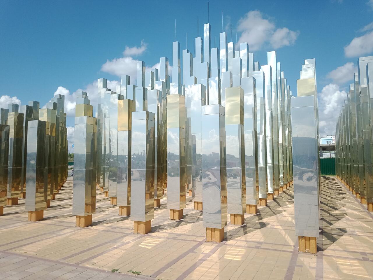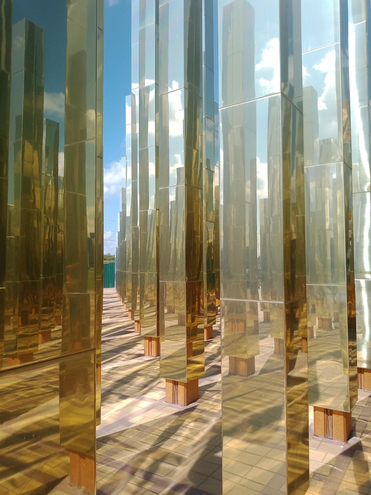 Световая инсталляция выполнена в виде пирамиды и состоит из золотых зеркальных колонн разных размеров. Самые большие из них достигают девять метров в высоту.