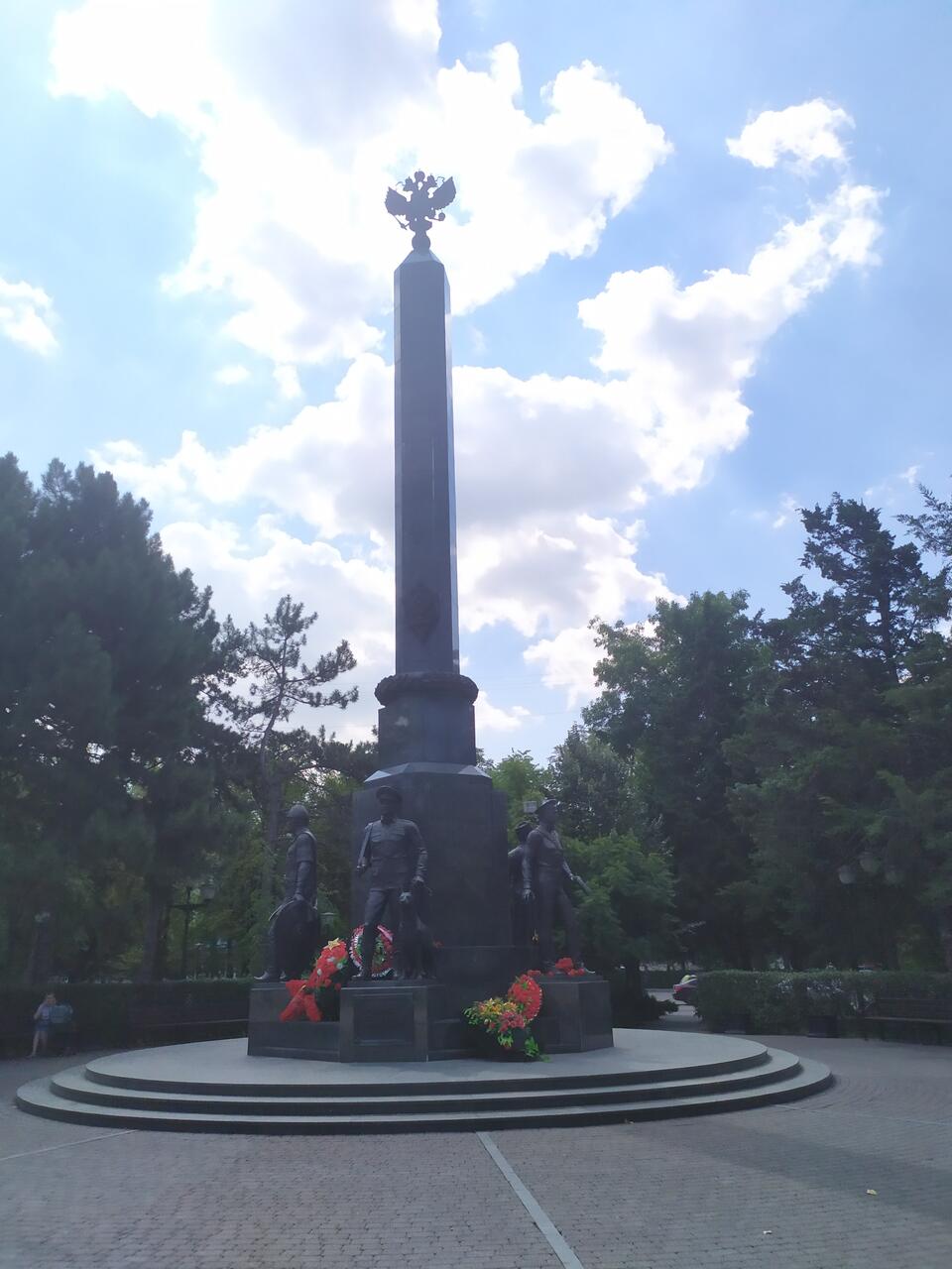 Памятников в сквере 2: пограничный столб и мемориал защитникам рубежей Отечества.