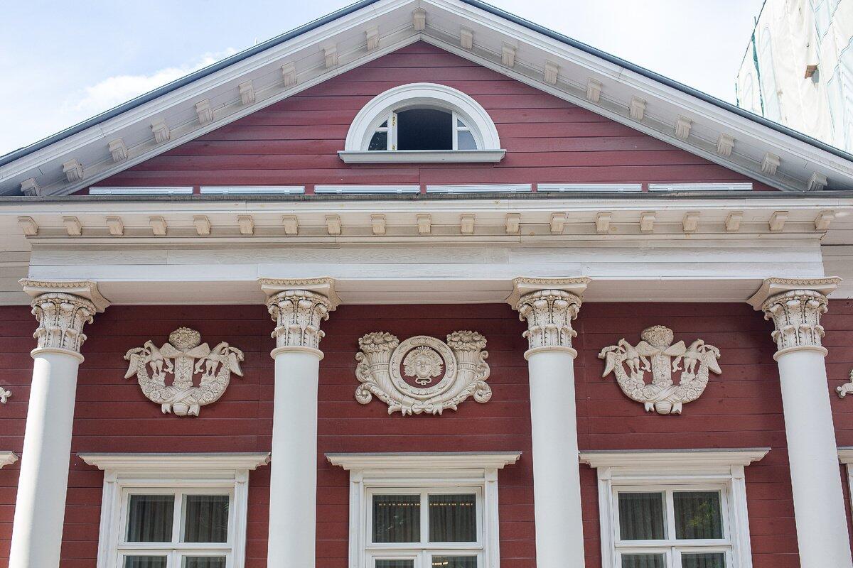 Восстановили тесовую обшивку, коринфскому портику вернули прежний облик, возродили фронтон, наличники на окнах и лепной декор (2 фото).