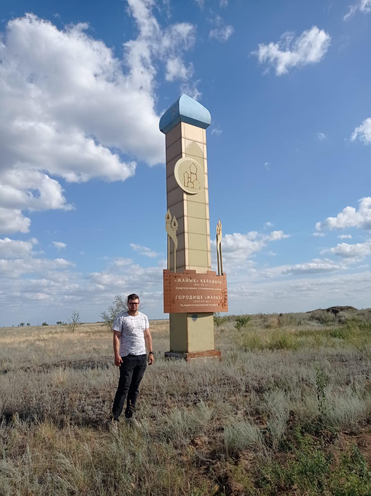 Жайык. Даже с асфальта видно странное сооружение – две башни, соединенные переходом. Вероятно, они должны олицетворять древнее городище. Стоит стела с информацией, что существенно облегчает задачу найти городище. Но, на самом деле, следы раскопов поблизости есть, но основные археологические исследования проходили примерно в 1-2 километрах от этого места.