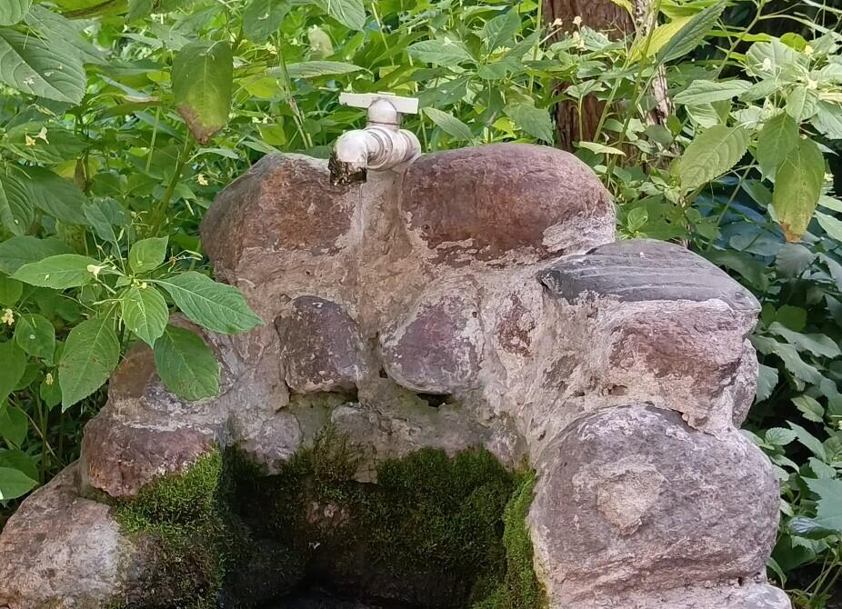 Постройки дворика как будто спрятались за деревьями и маскируются среди них.