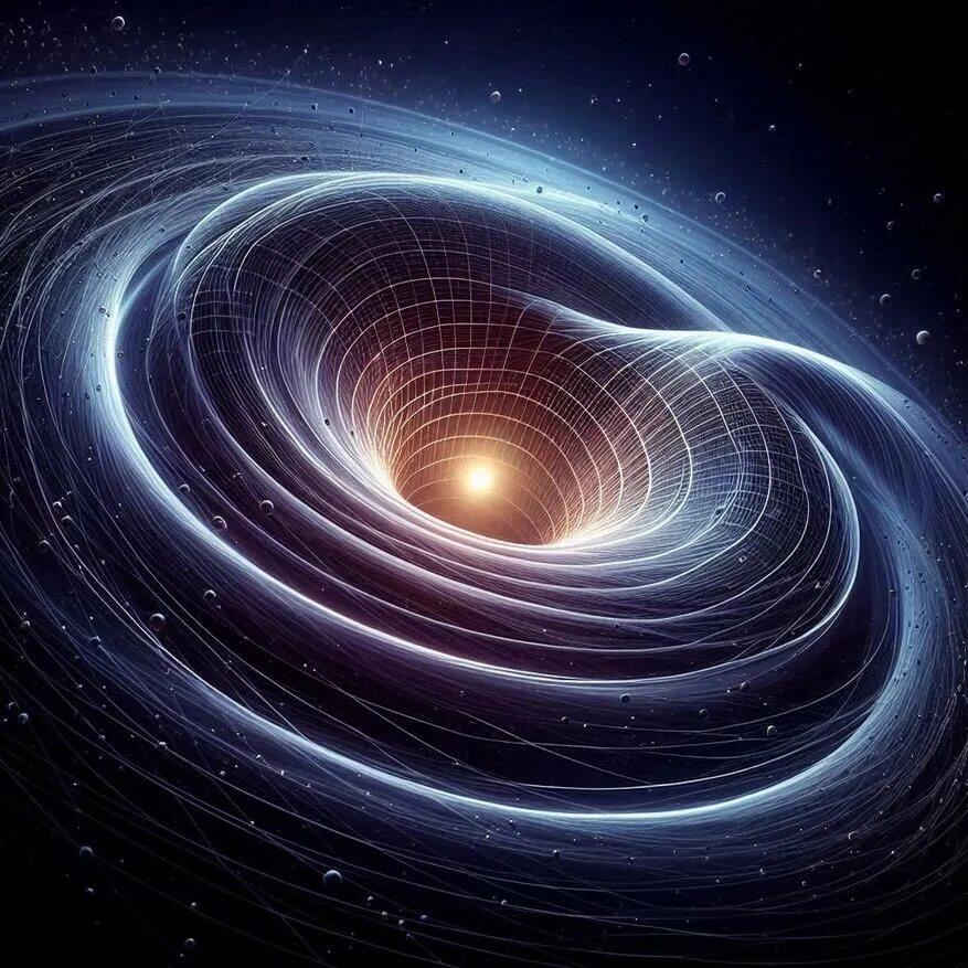 Композиция представляет собой трехмерное изображение черной дыры в виде воронки с многочисленными пространственно-временными деформациями в точке сингулярности внизу воронки. Медное основание показывает, как пространство-время искривляется вблизи черной дыры.