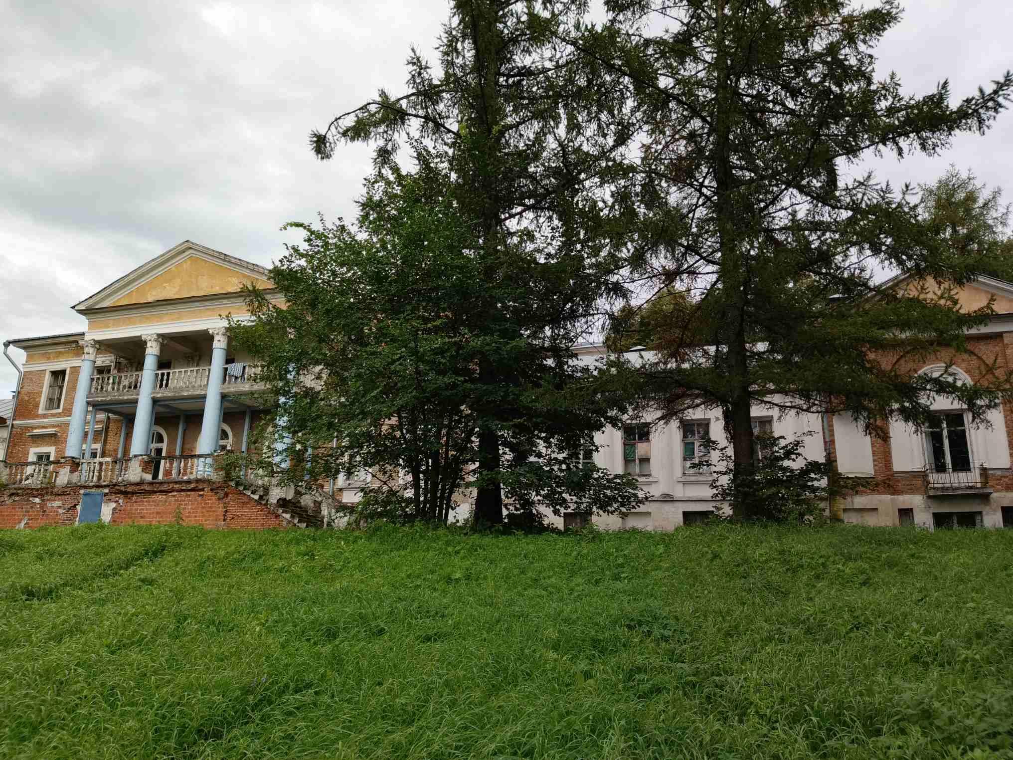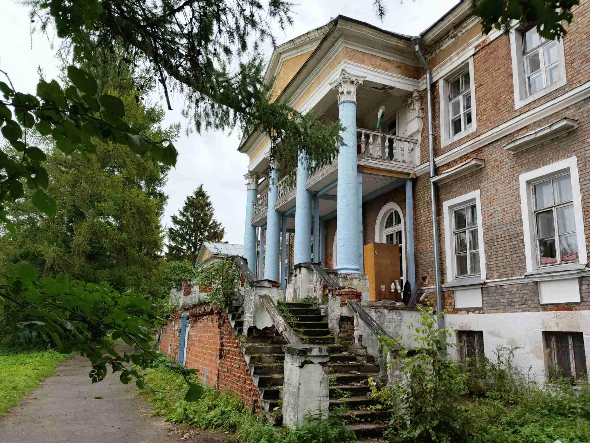 В советское время в здании главного дома была больница, сейчас похоже помещения разобрали под частные квартиры, а вокруг завели огородики. Здание выглядит сильно уставшим. И вообще, каких только чудес тут не увидишь, вот к примеру шторы из коллекции "Челябинск":