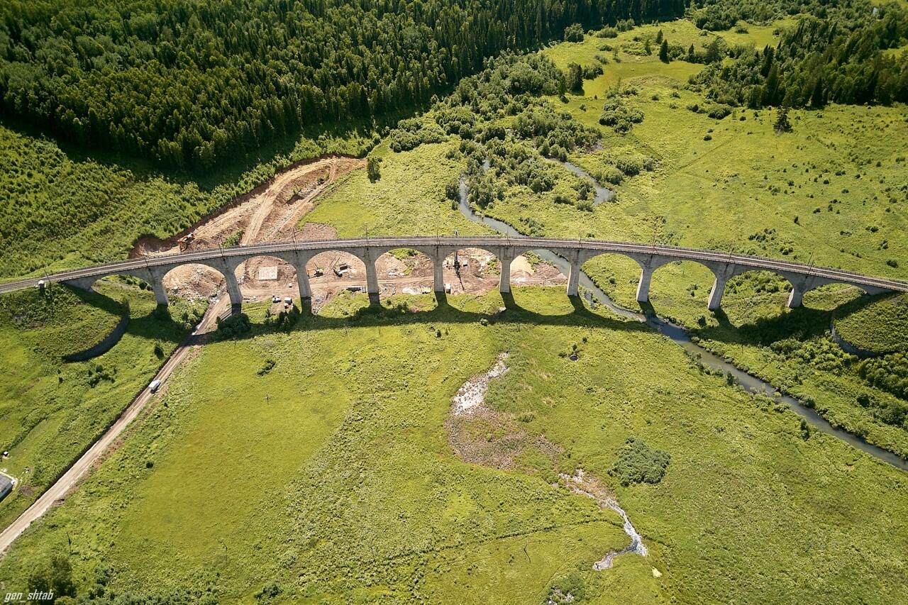На подходе к Красноуфимску железная дорога пересекает северную оконечность Уфимского плато и Сылвинский кряж. С точки зрения инженерных условий – это даже более сложное препятствие, чем Главный Уральский хребет. И именно здесь в 1914 – 1919 годах было построено семь уникальных виадуков, а также четыре горных тоннеля (самый длинный из которых достигает 2 километров). Виадук – слово латинское, образовано из двух слов: «виа» – дорога, «дуко» – веду. Русское слово «путепровод» – прямой аналог. Это сооружение мостового типа, возводимое на пересечении железной дороги с глубоким оврагом. Обычно виадуки строили в местах, где создавать высокую дорожную насыпь было экономически невыгодно. В данном случае сказались особенности рельефа в пределах Уфимского плато – с многочисленными глубокими долинами рек и логами, промытыми в мягких известковых породах среди всхолмленной равнины. Автором проектов всех виадуков является профессор С.И. Белзецкий. В разных источниках также упоминаются инженеры П.В. Щусев, О.А. Моддерсон и М.Ф. Клочанов. Вот эти исторические виадуки, расположенные на границе Пермского края и Свердловской области – по ходу следования от Казани к Екатеринбургу (и ссылки на тайники, посвященные им):