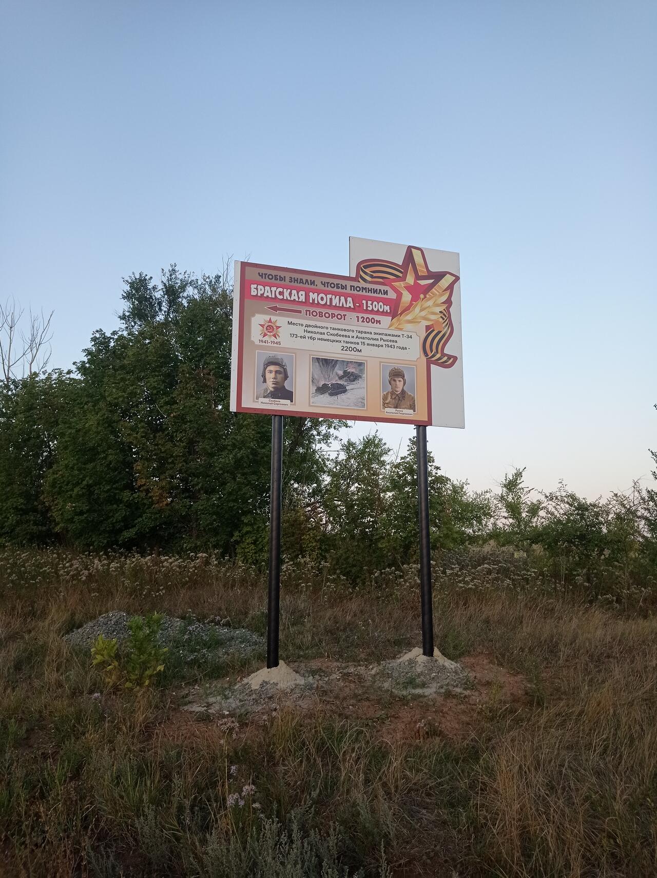 На повороте к Братской могиле стоят информационные стенды. Это заслуга благодарных жителей Кантемировки. Активистов Кантемировской организации поисковиков «Живая Память», которые на народные деньги увековечили память героев, совершихся двойной танковый таран. Погибли ради жизни.