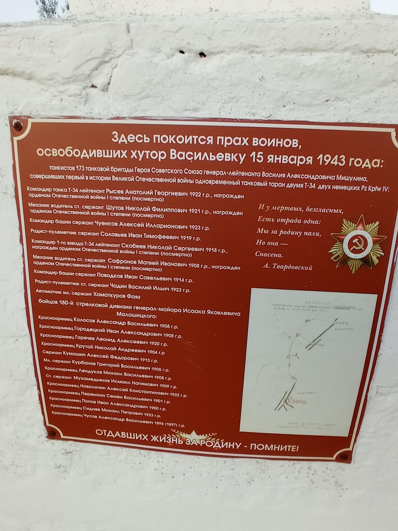 Сегодня от хутора Васильевка осталось только кладбище и памятник героям-танкистам 173 танковой бригады.