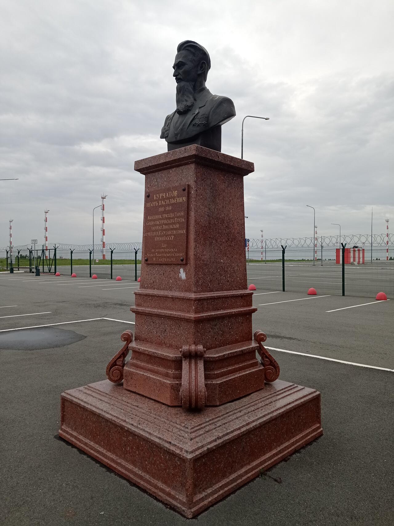 «Атомные» мотивы и этапы богатой биографии Игоря Васильевича нашли отражение в стильном дизайнерском оформлении нового терминала – это и портреты самого учёного, и информационные стенды об этапах его жизни и деятельности, инсталляция в виде атома и формулы на стенах и стеклянном ограждении эскалатора и парапетов. Кроме того, на улице, слева от терминала российских авиалиний, был установлен бюст И.В. Курчатова. Его подарил скульптор М.Л. Сердюков из Краснодарского края – автор проекта «Аллея Российской Славы». Постамент исполнен из гранита. На нём – мемориальная табличка с перечислением наград и заслуг академика. Сам бюст отлили из бронзы.