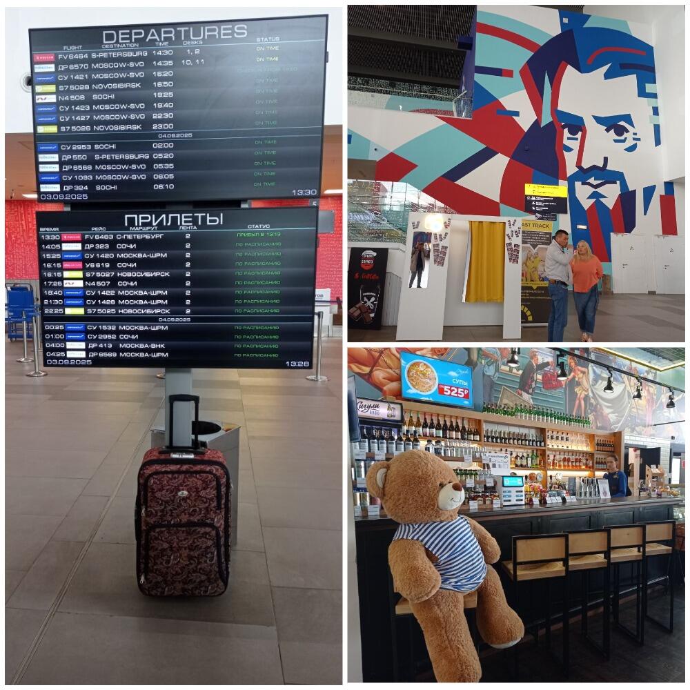 Здание вокзала двухэтажное – первый этаж это зоны регистрации и выдачи багажа. Здесь же находится и кафе, в котором я, кстати, после регистрации на рейс немного перекусила. Обслуживание на высоте! Но, правда, цены тоже. Но так, как известно, везде и во всех аэропортах. На втором этаже находится зона паспортного контроля, зал ожидания, зоны вылета с выходами на посадку и несколько кафе на ваш выбор и сувенирных киосков. Здесь комфортно и удобно. А ещё здесь есть мини-кинозал. Я до вылета некоторое время посмотрела научно-популярный фильм о ядерной физике – в простой доступной форме. Мне понравилось. Я, гуманитарий, всё поняла. -))) И тут же вы можете познакомиться с одной, любимой челябинцами достопримечательностью – кофе и мороженое вам продаст забавный робот-бариста.
