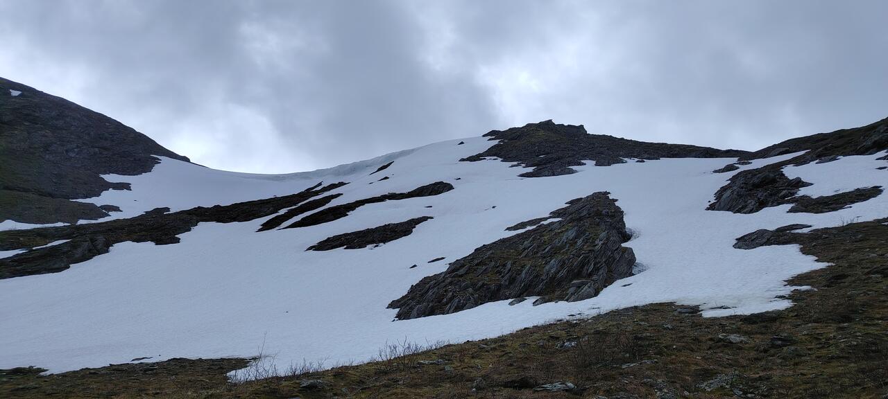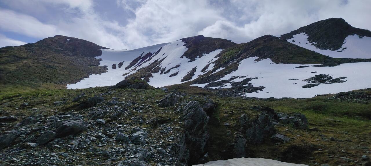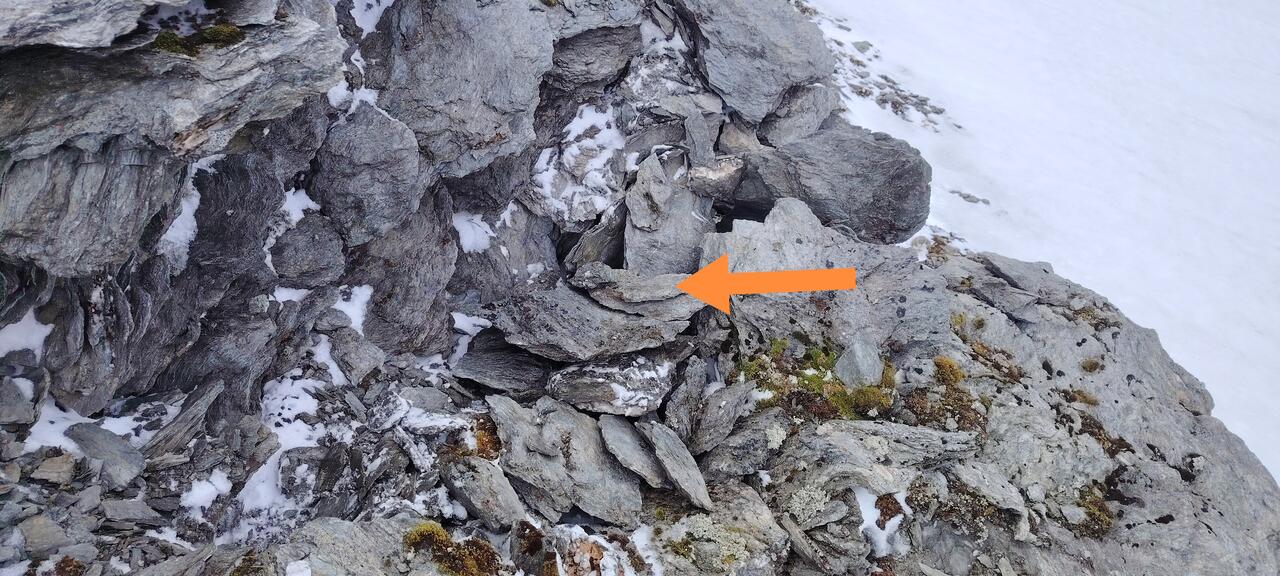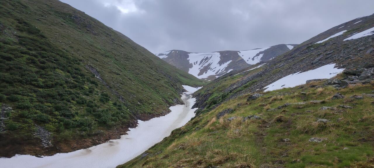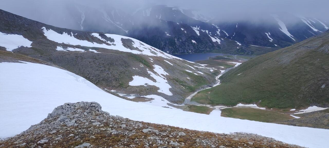 В снежный год, как например это было в июле 2025-го, прямой спуск с перевала может быть полностью закрыт обширным карнизом. Более простой путь, напротив, освобождается от снега первым.