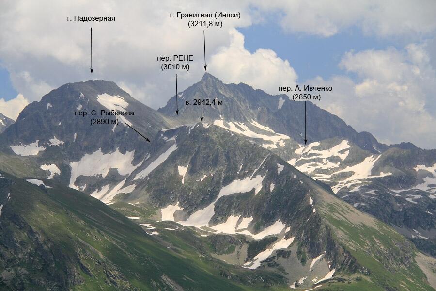 Со стороны перевала Поднебесного к вершине Инпси можно отправиться двумя маршрутами (см.фото). Можно по голубой линии отправиться на малую вершину и, полюбовавшись с нее открывшимися видами на озёра Гуманоидов, Забвения и Импактное, а также на долины рек Светлая и Дамхурц – на этом и завершить свое восхождение. Можно по гребню попробовать все же достичь вершины Инпси (либо подойдя к ней по гребню поближе, изменить маршрут и перебраться на «красную линию».