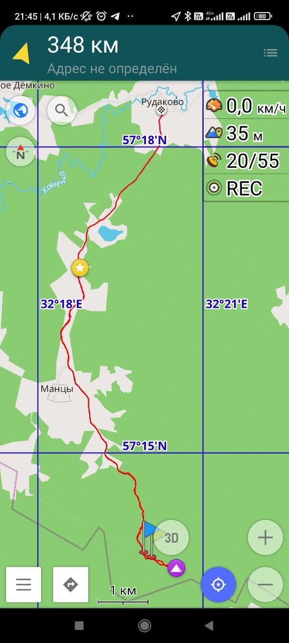 Дальше - на своих двоих. Навигатор сообщил, что до Манцы остаётся ещё 2,6 км. Координаты этой точки – N 57 16.817 E 32 18.765. Здесь от озера подходит какая-то заросшая дорожка и можно спокойно развернуться.