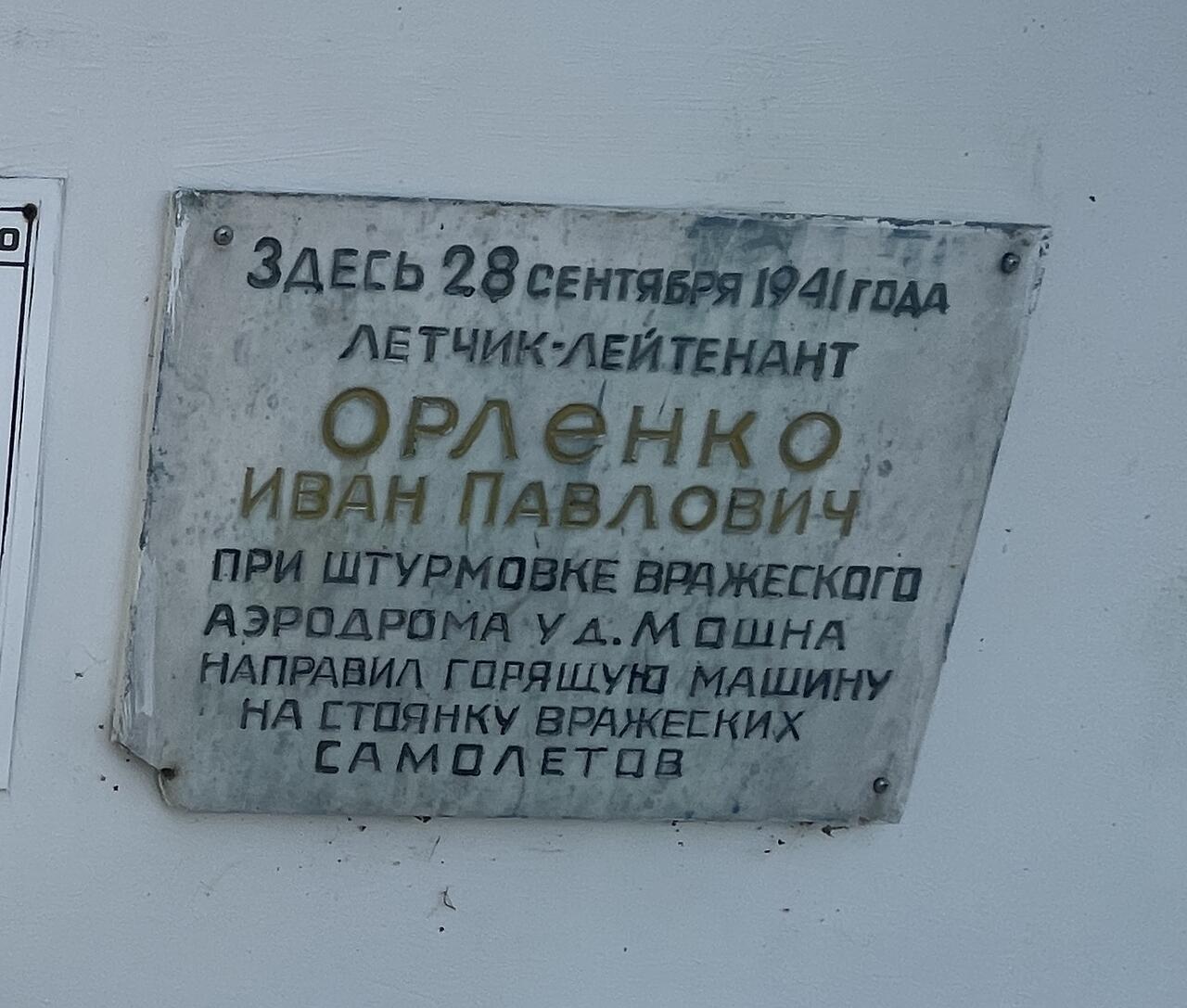 Все таблички стандартные и одна - как бы не в стиль, не в тему. Цитирую: "Здесь 28 сентября 1941 года летчик-лейтенант Орленко Иван Павлович при штурмовке вражеского аэродрома у д.Мошна направил горящую машину на стоянку вражеских самолетов".