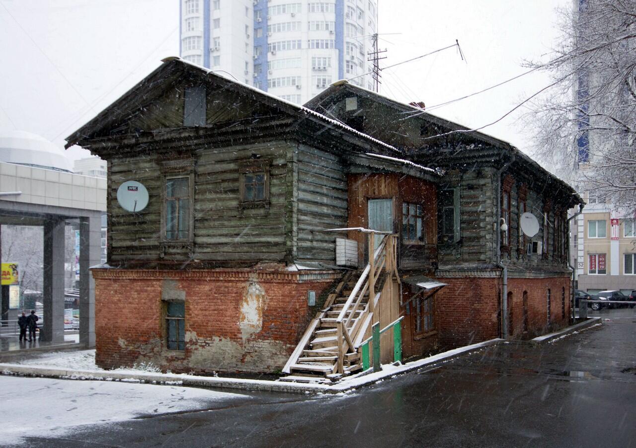 Оригинальный по композиции небольшой городской дом с гармоничным декором фасадов и характерной для Хабаровска пропильной резьбой. Расположен, главным северо-восточным торцевым фасадом на красной линии ул. Дзержинского, представляет собой двухэтажный объем с кирпичным цоколем и втором этажом из сосновых бревен. Состоит из Г-образно соединенных торцами неравных частей, каждая из которых имеет двухскатную крышу. Поперечными и продольными капитальными перегородками верхний этаж делится на прихожую, гостиную, спальную и столовую с кухней, нижний – на торговый зал, складское и подсобное помещения винно-гастрономического магазина. В декоре главного фасада сочетается цепная лицевая кладка цоколя с выразительными пунктирными наличниками и открытый сруб второго этажа с пропильной резьбой наличников окон, подзоров карнизов, обшивкой тимпана фронтона. Дом сохранил филенчатое полотно дверей, выразительный кованый навес над входом главного фасада. Крытые на один скат северо-западная и южная веранды переделаны в сени. (с) https://perechen.nasledie27.ru